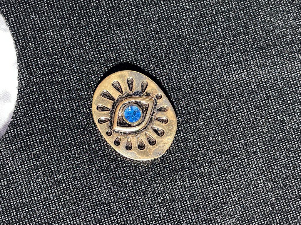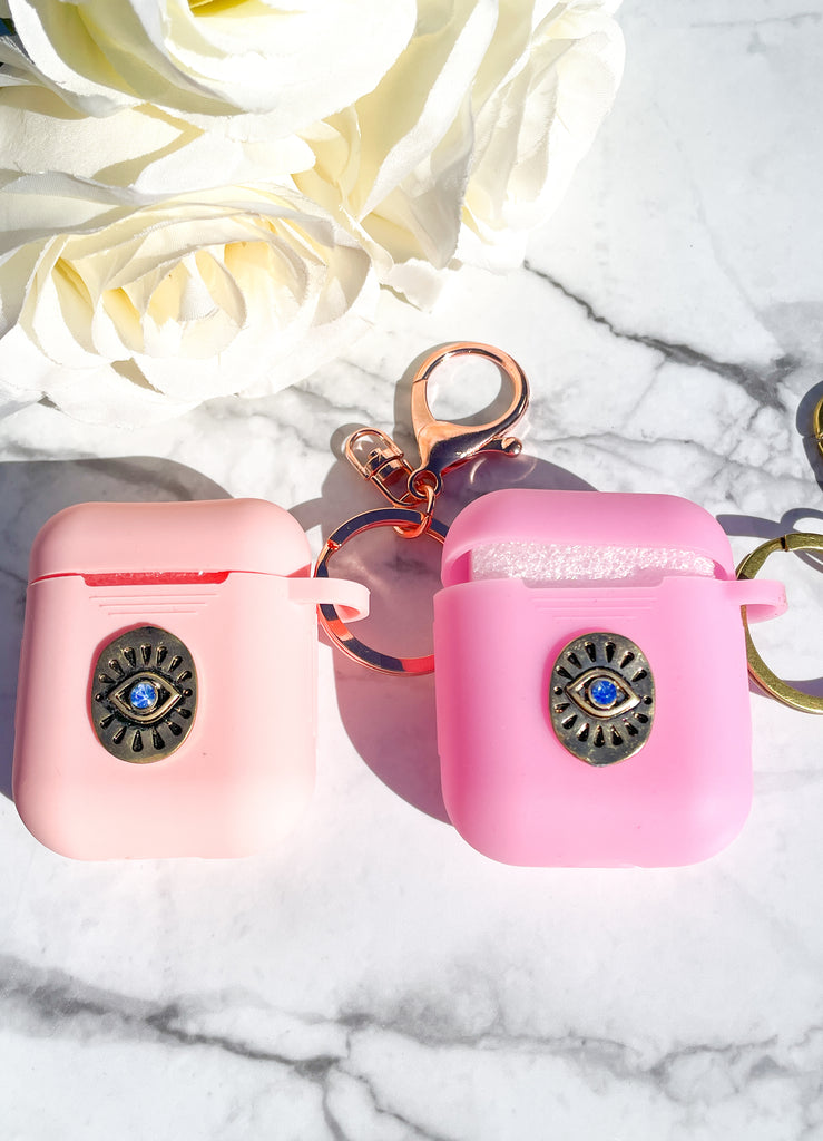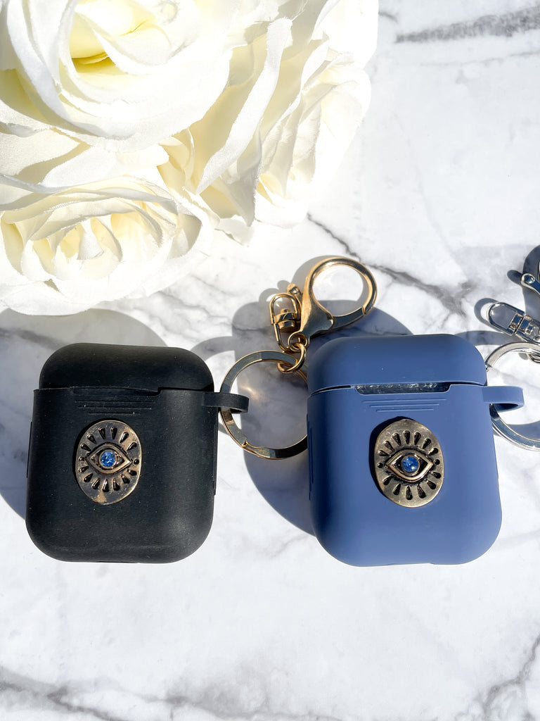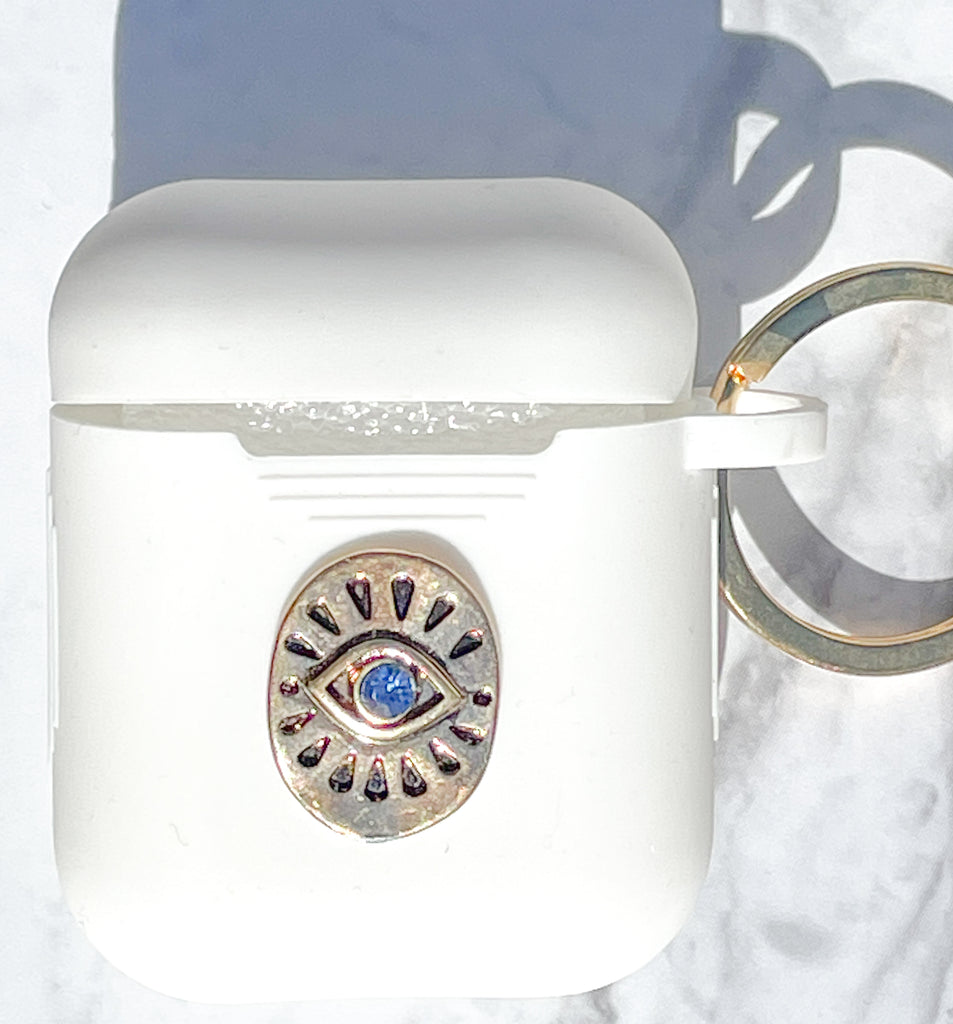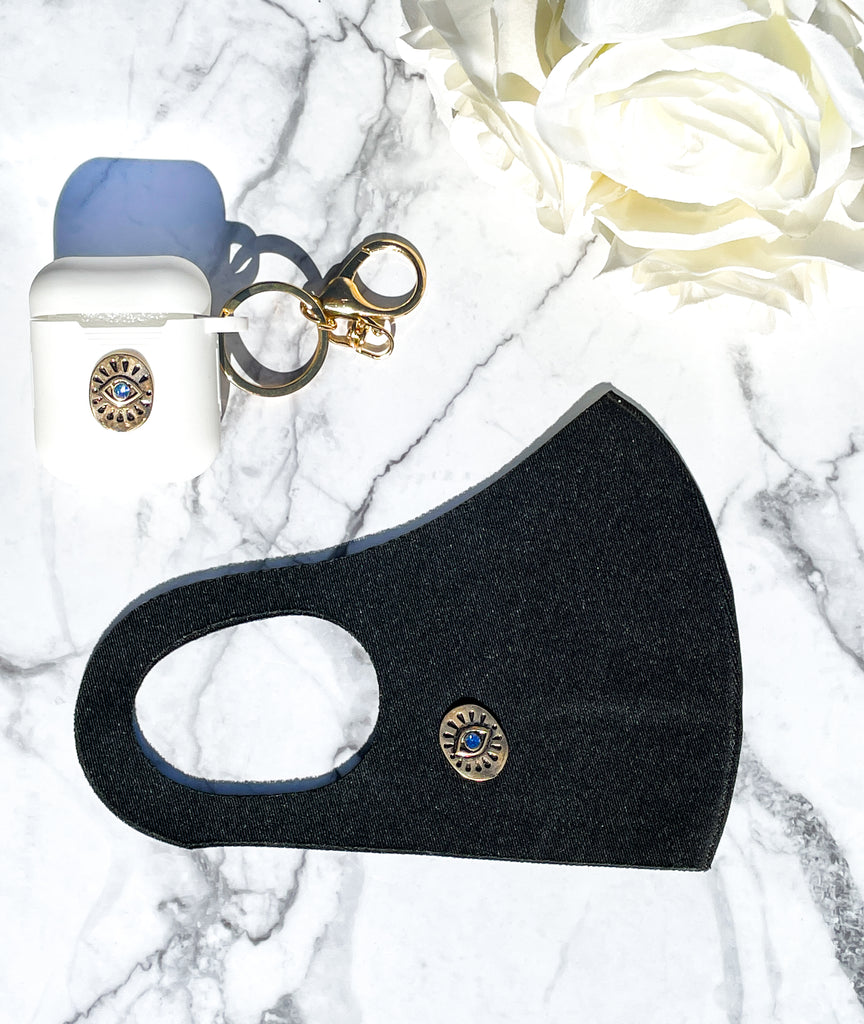 Gold and Rhinestone Blue Evil Eye AirPods Case and Face Mask 1
