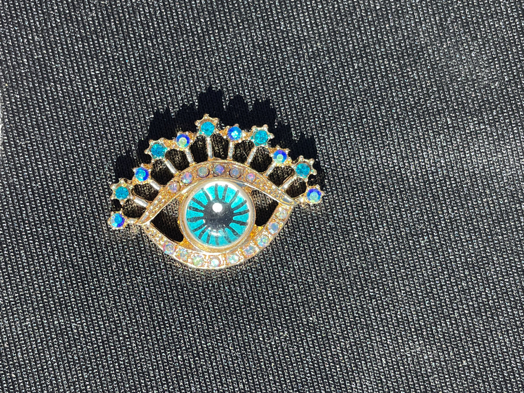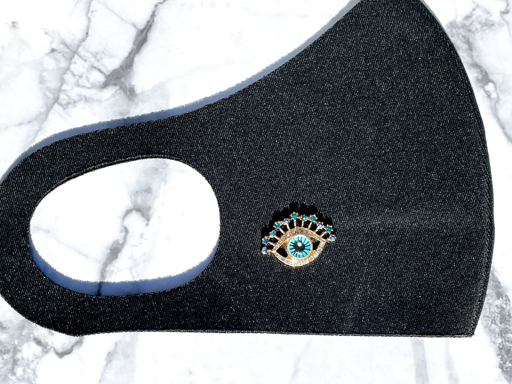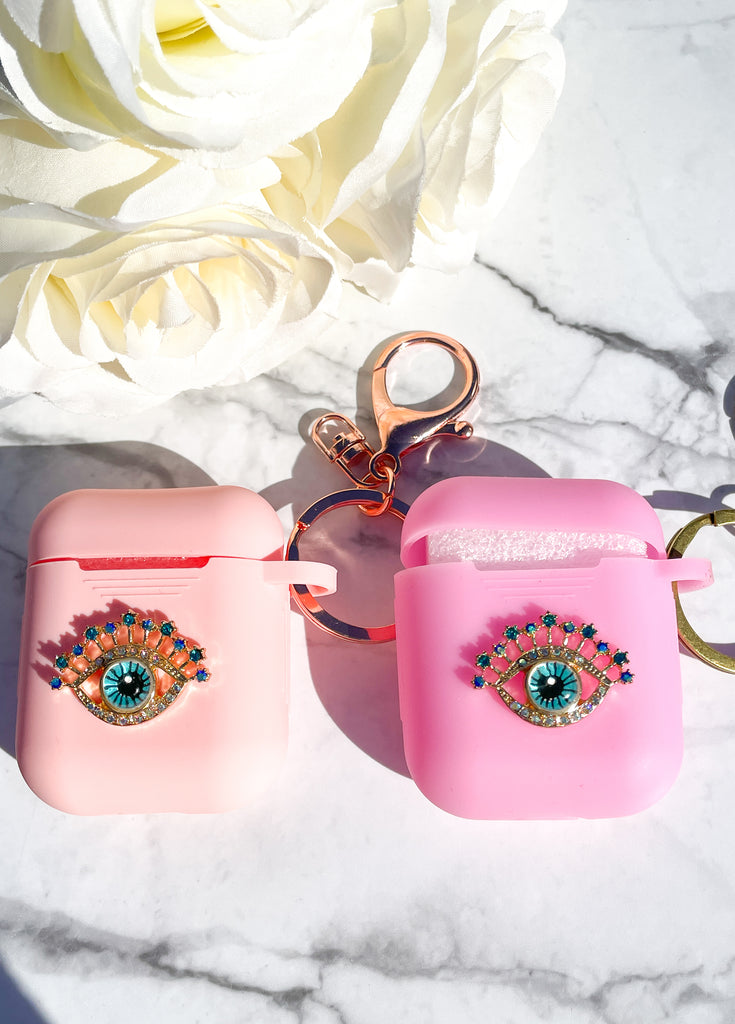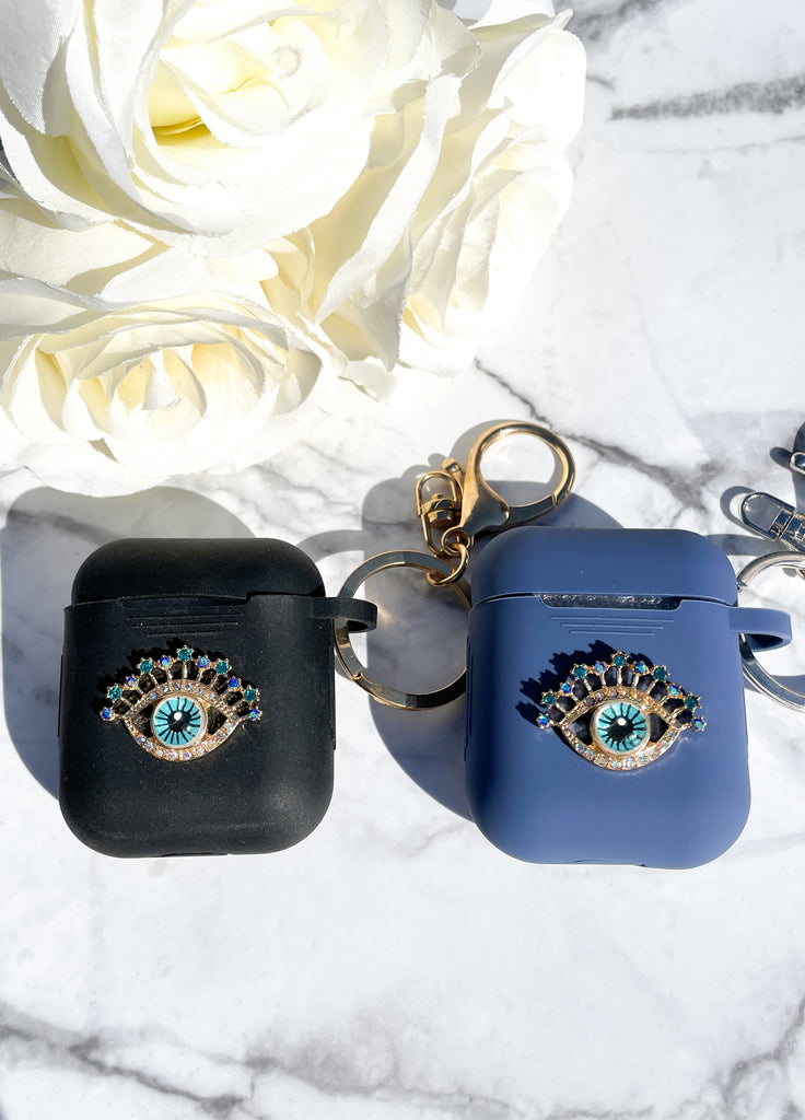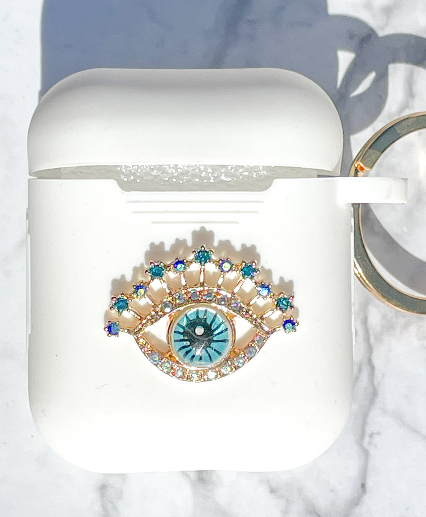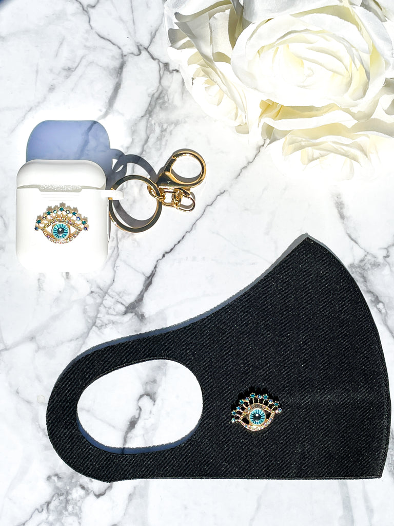 Gold and Turquoise Rhinestones Evil Eye AirPods Case and Face Mask 1