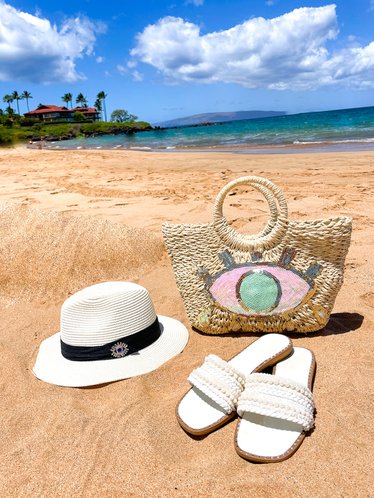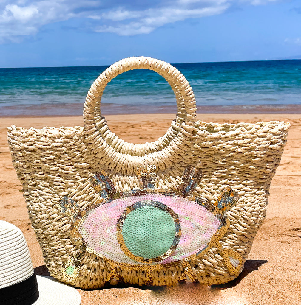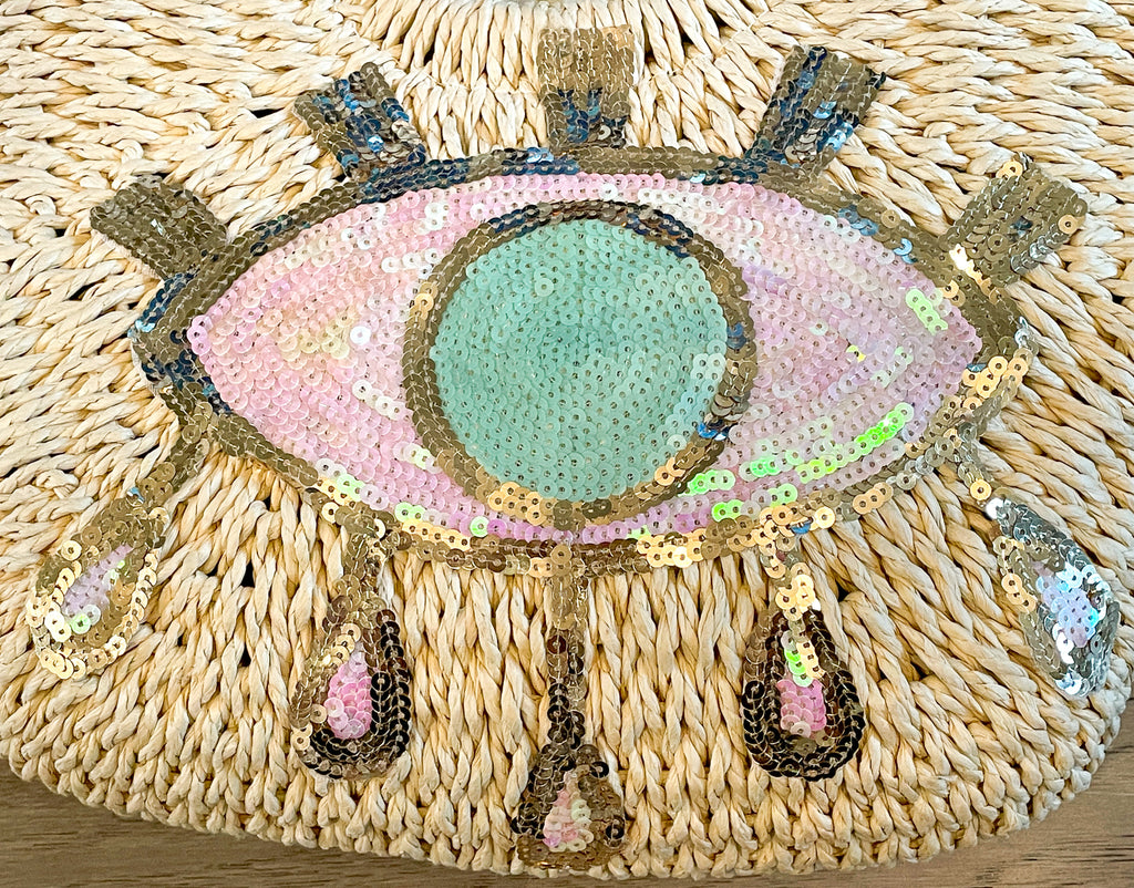 👁️💎✨ This is your perfect straw bag! Unique and glamorous, make a statement with your custom bag and instantly dress up any outfit and look stylish on vacation to the beach or lake! It is the perfect size to fit all of your essentials - phone, makeup, keys, wallet, etc.