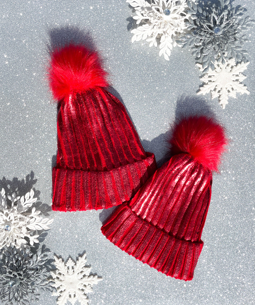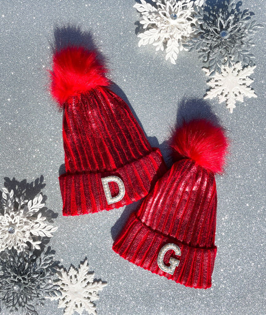 ❄️ Kids Custom Pearl and Rhinestone Monogram Shimmer Red Beanie - Ski Beanie / Fur Beanie / Knit Beanie / Rhinestone Beanie / Bling Beanie / Winter Hat / Monogram Hat ❄️