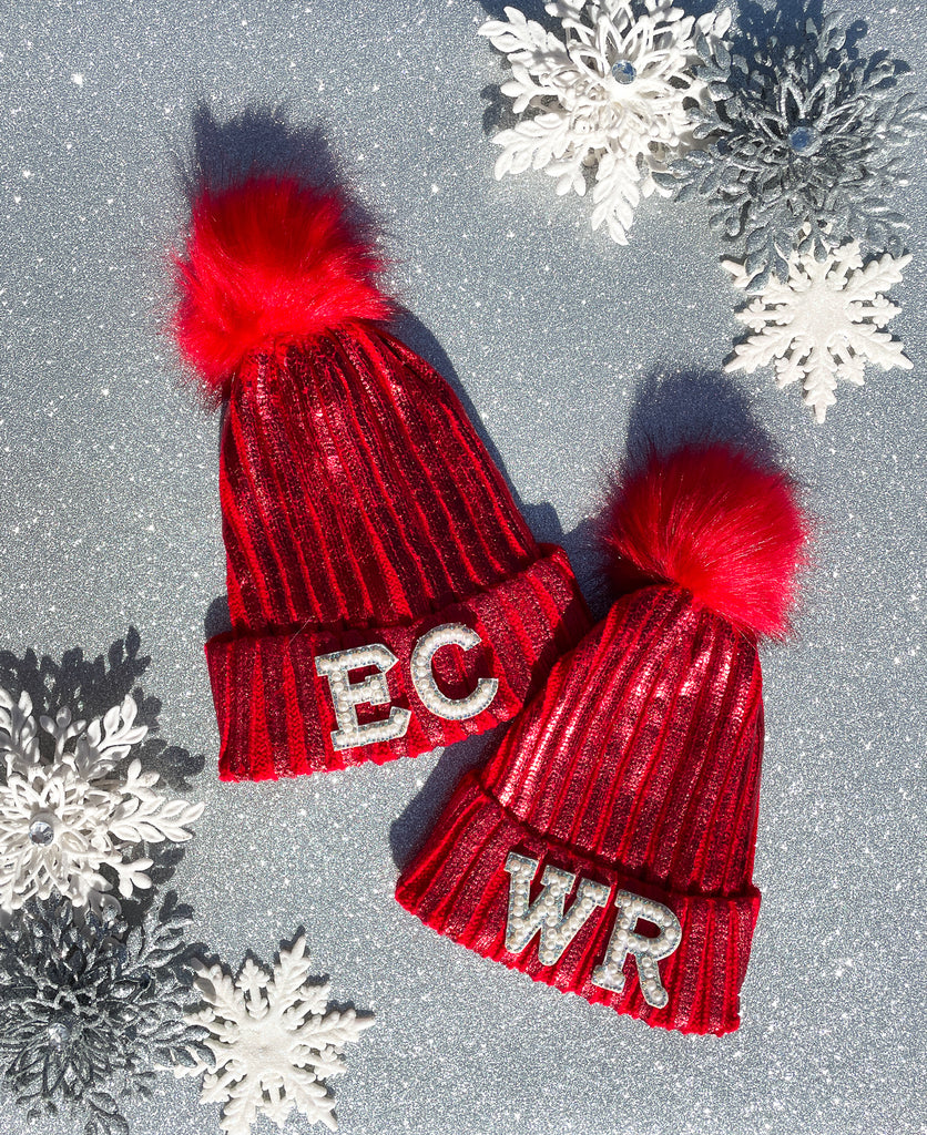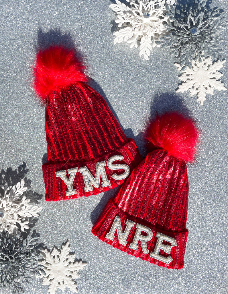 KIDS Custom Pearl and Rhinestone Monogram Red Shimmer Beanies