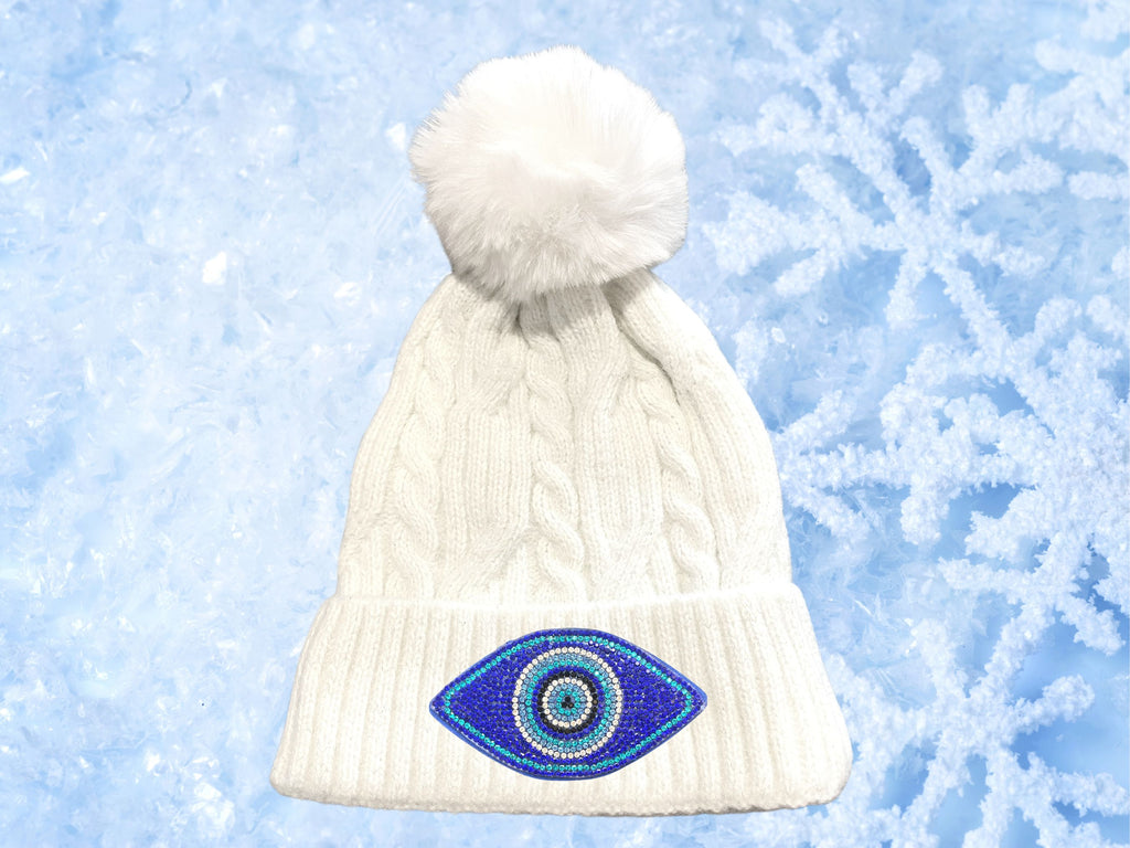 ❄️ Rhinestone Evil Eye Beanie - Ski Beanie / Fur Beanie / Knit Beanie / Rhinestone Beanie / Cream Beanie / Bling Beanie / Winter Hat / Glam Hat ❄️