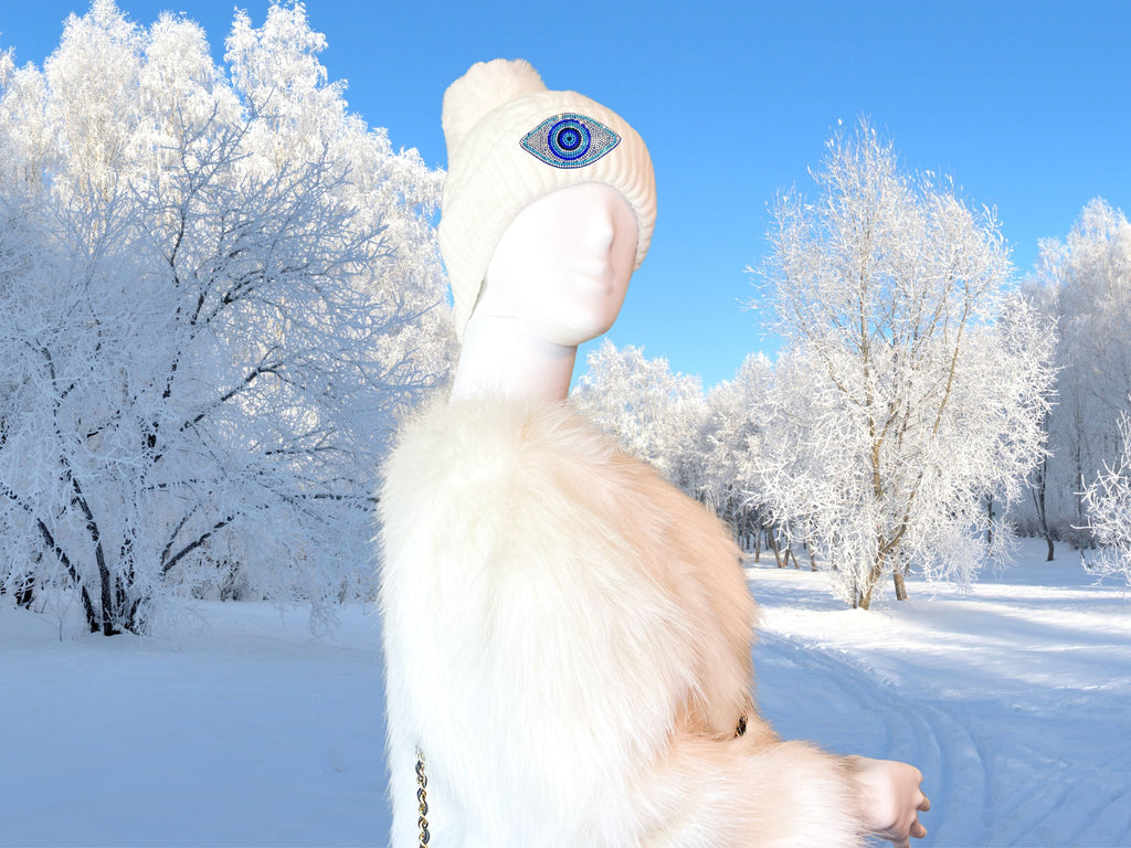 ❄️ Rhinestone Evil Eye Beanie - Ski Beanie / Fur Beanie / Knit Beanie / Rhinestone Beanie / Cream Beanie / Bling Beanie / Winter Hat / Glam Hat ❄️