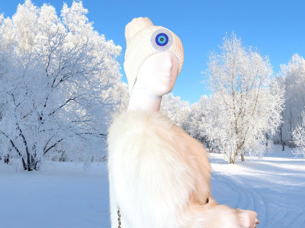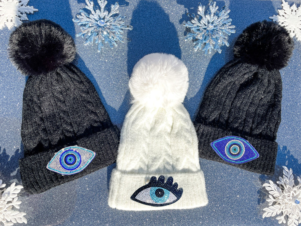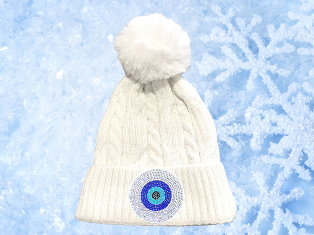❄️ Rhinestone Evil Eye Beanie - Ski Beanie / Fur Beanie / Knit Beanie / Rhinestone Beanie / Cream Beanie / Bling Beanie / Winter Hat / Glam Hat ❄️