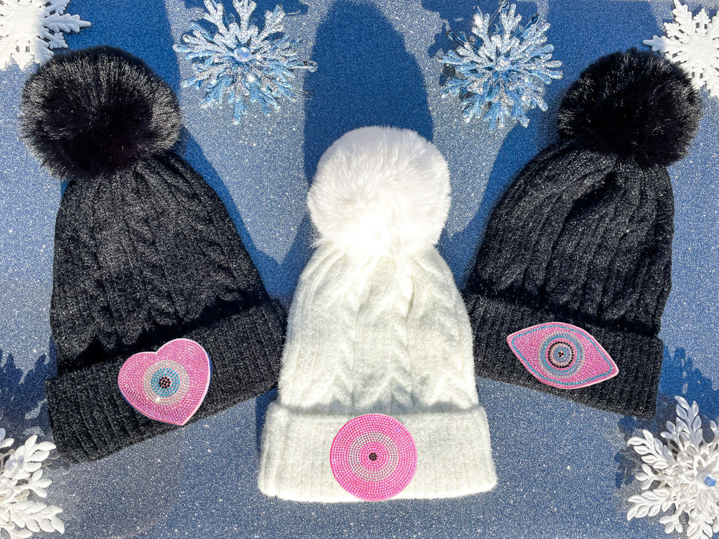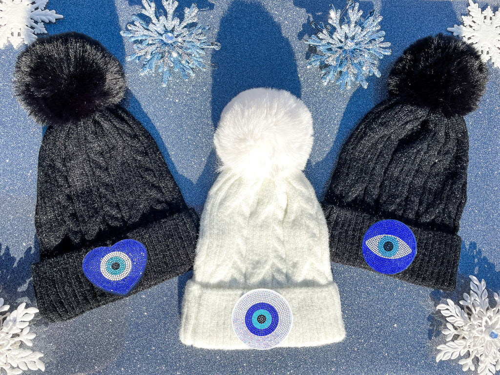 ❄️ Rhinestone Evil Eye Beanie - Ski Beanie / Fur Beanie / Knit Beanie / Rhinestone Beanie / Cream Beanie / Bling Beanie / Winter Hat / Glam Hat ❄️