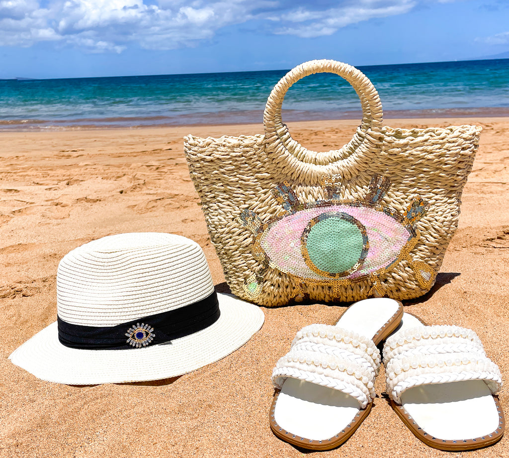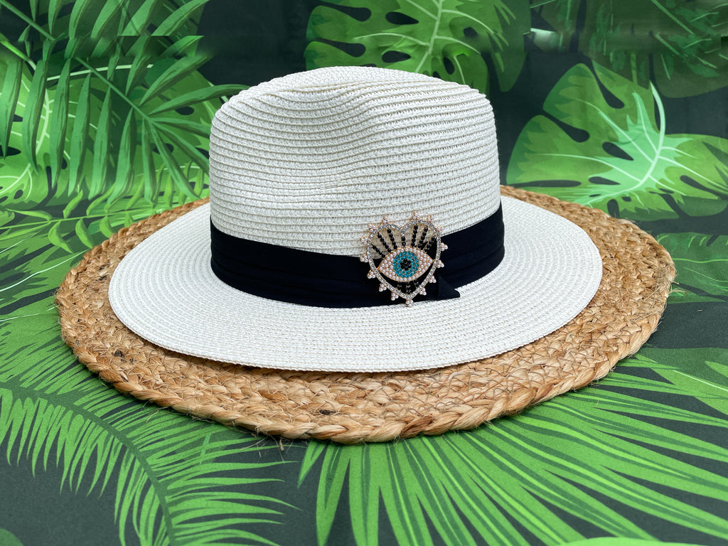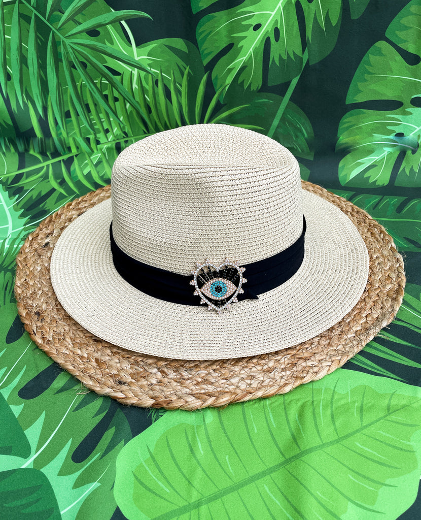 Black Rhinestones and Pearls Blue Heart Evil Eye Panama Hat