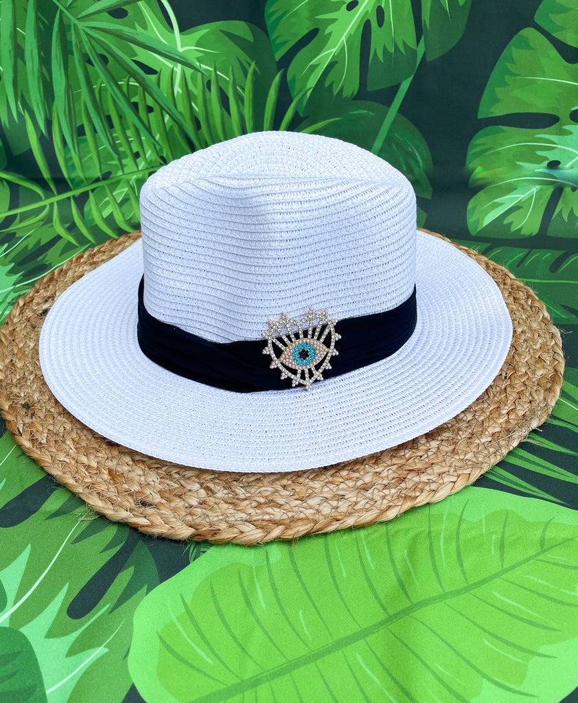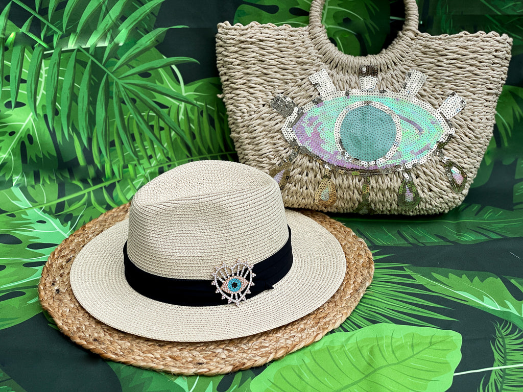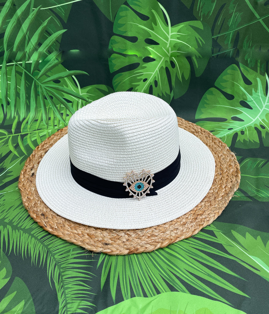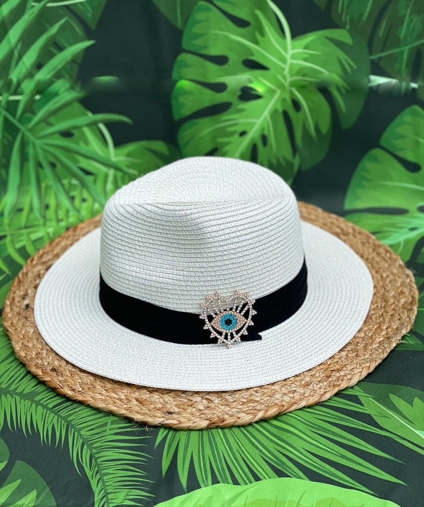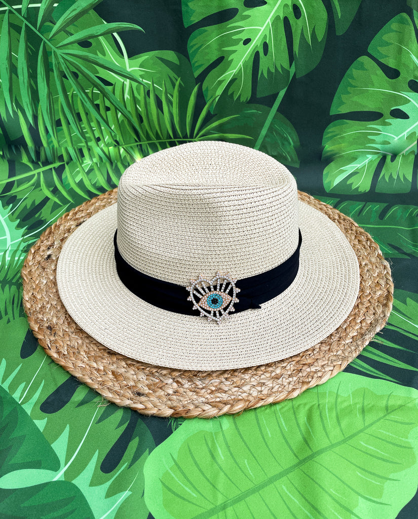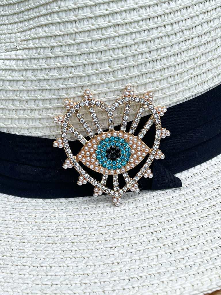 Rhinestones and Pearls Blue Heart Evil Eye Panama Hat