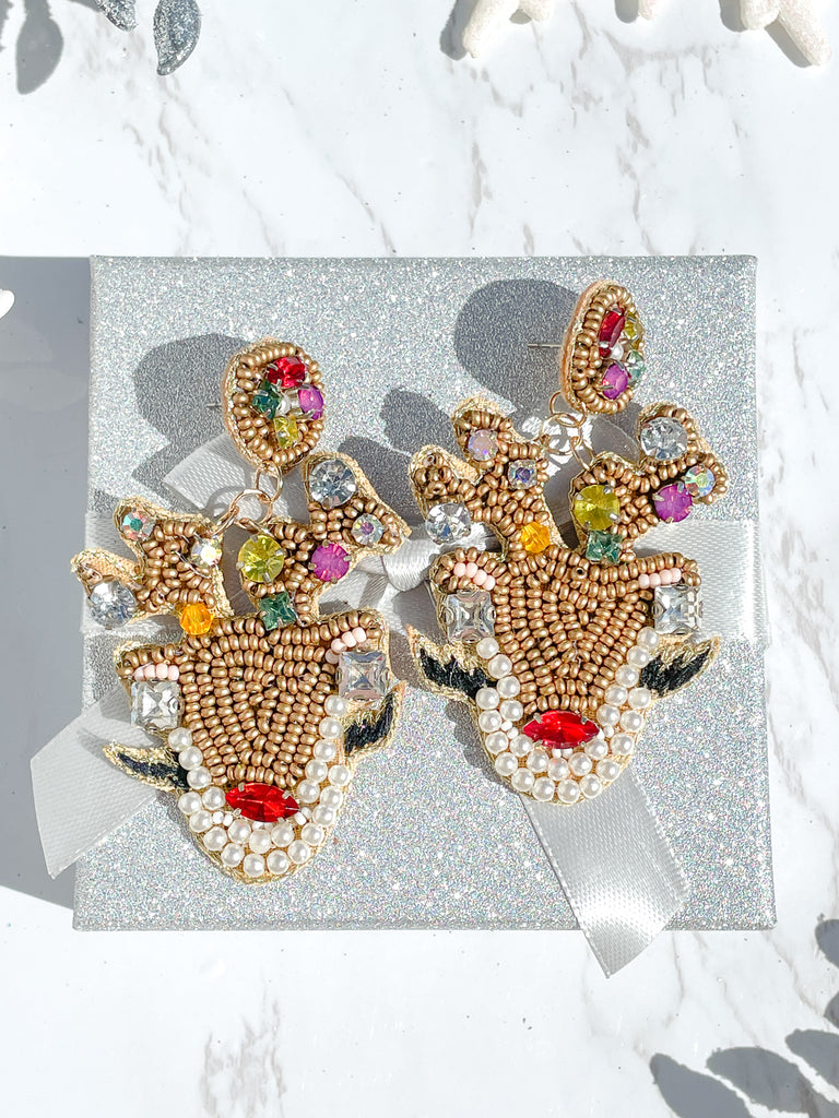 Beaded and Rhinestone Rudolph Christmas Earrings