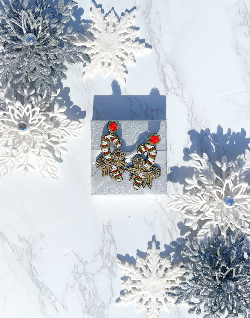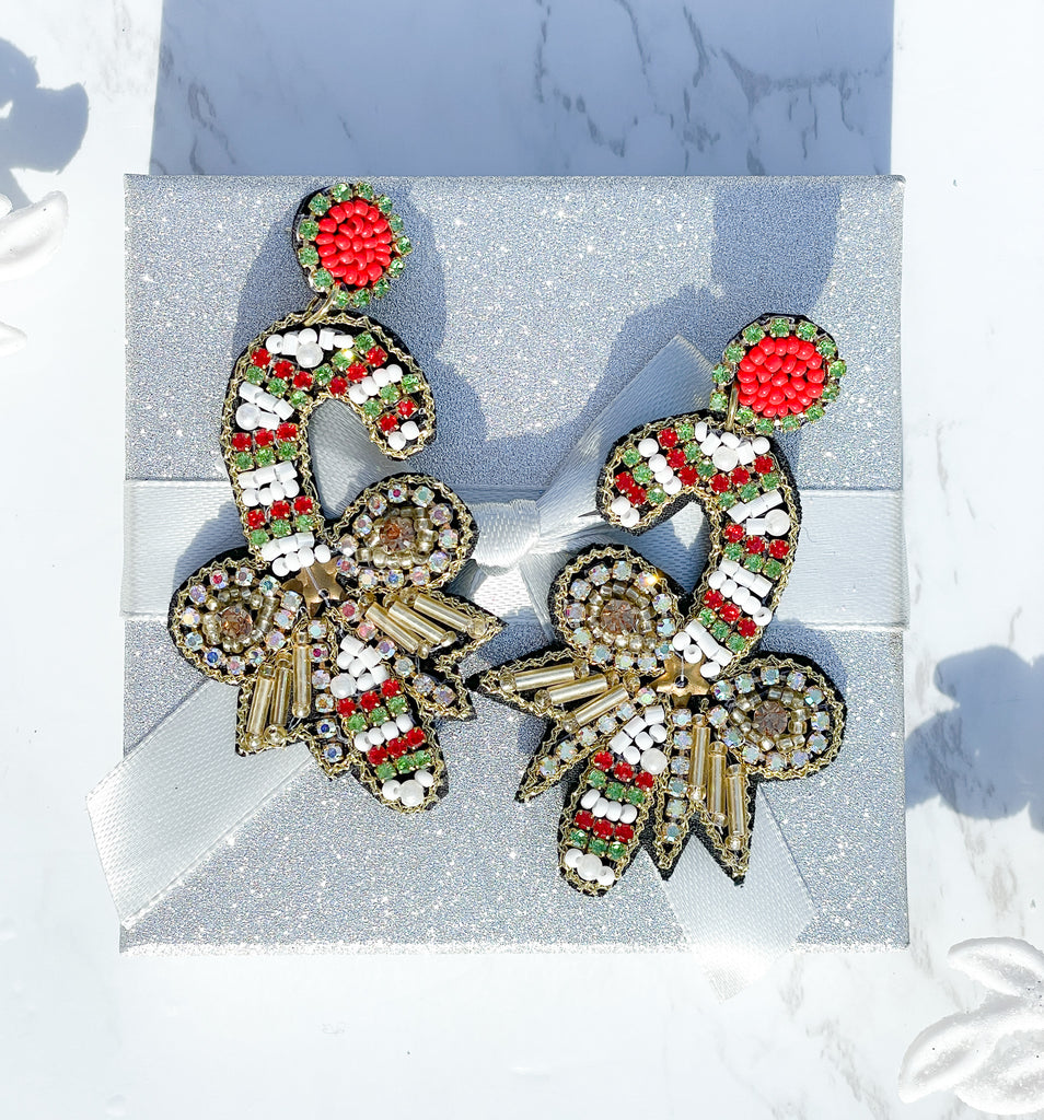 ๐ Beaded and Rhinestone Candy Cane Christmas Earrings Holiday Earrings / Festive Earrings / Candy Cane Earrings / Bow Earrings /Xmas Earrings๐