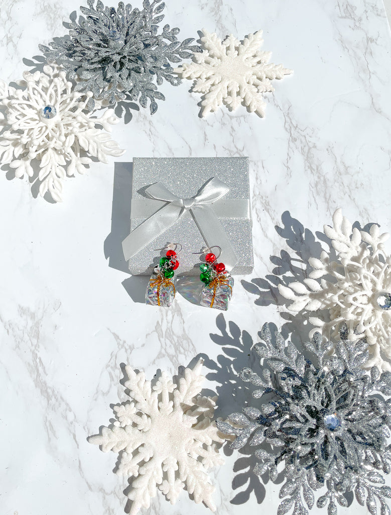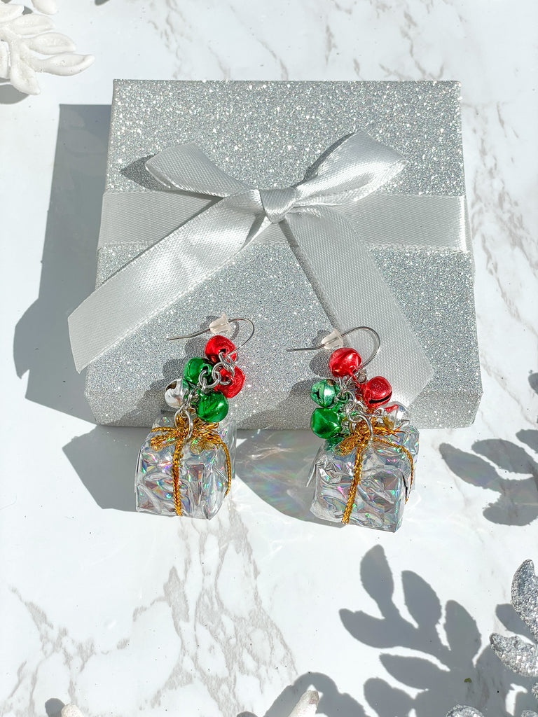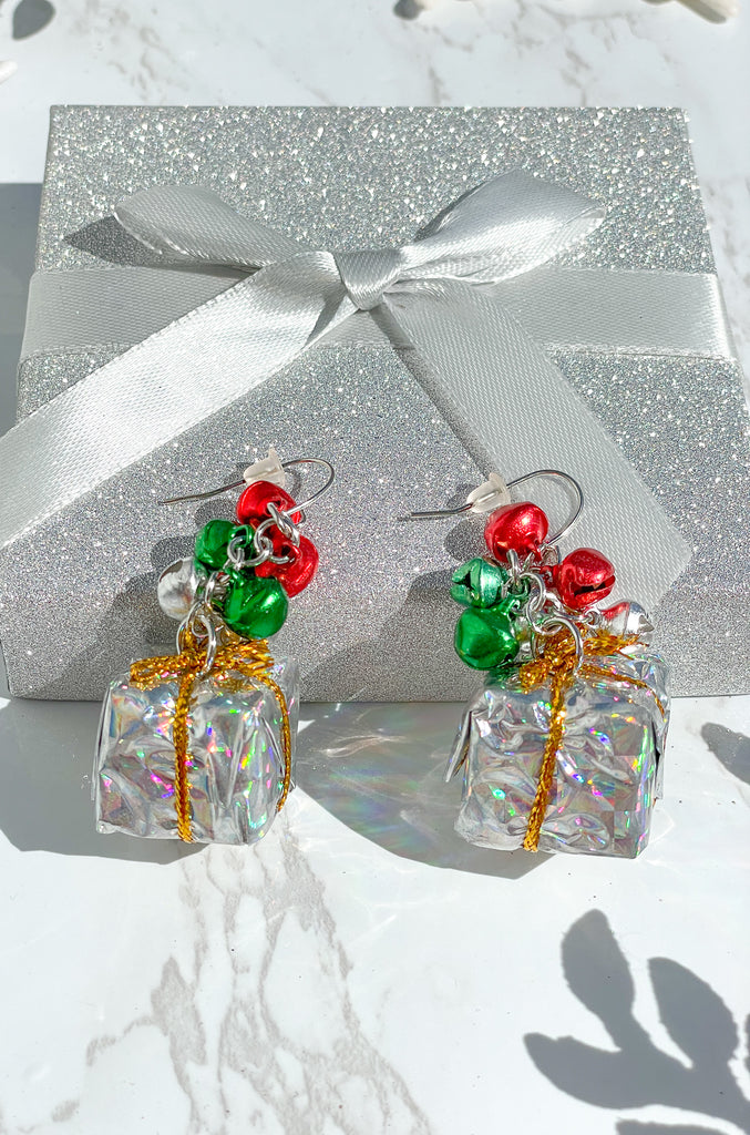 ππ Silver Present with Bells Christmas Earrings - Holiday Earrings / Festive Earrings / Present Earrings / Bell Earrings / Xmas Earrings ππ