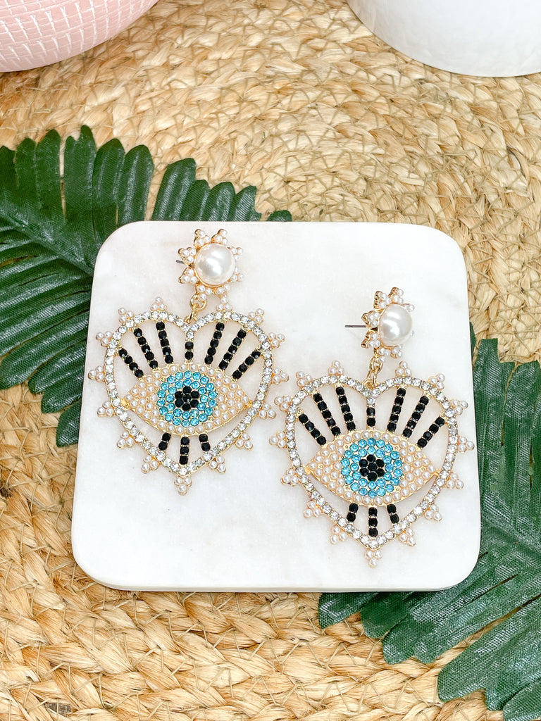 Black Rhinestones and Pearls Blue Heart Evil Eye Earrings