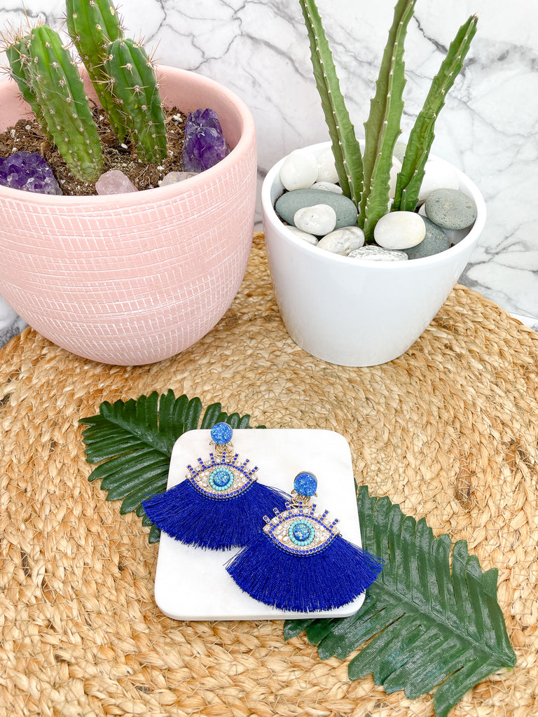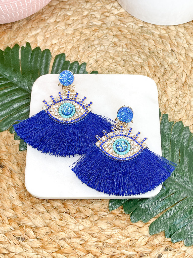 Gold, Blue and Turquoise Druzy Rhinestone Evil Eye Earrings