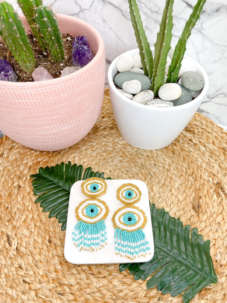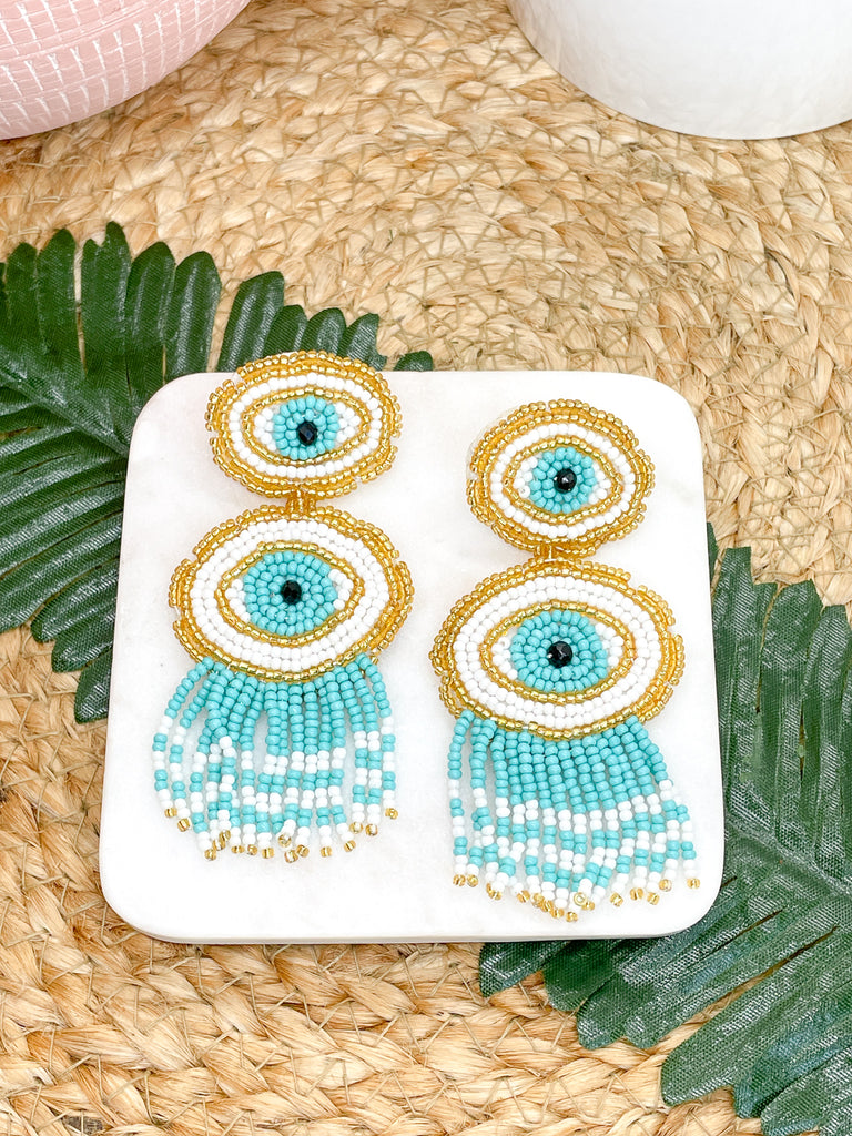 🧿 Gold, White and Turquoise Beaded Fringe Evil Eye Earrings