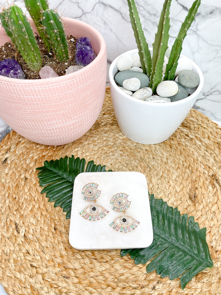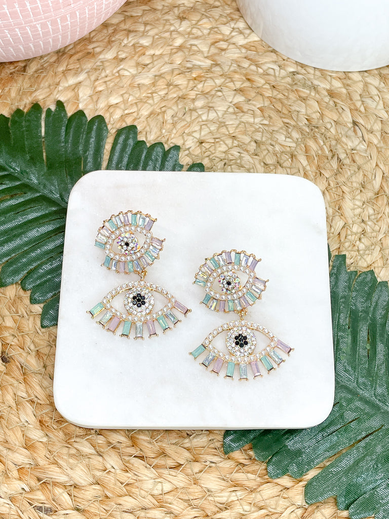 Pastel Rhinestone and Pearls Evil Eye Earrings
