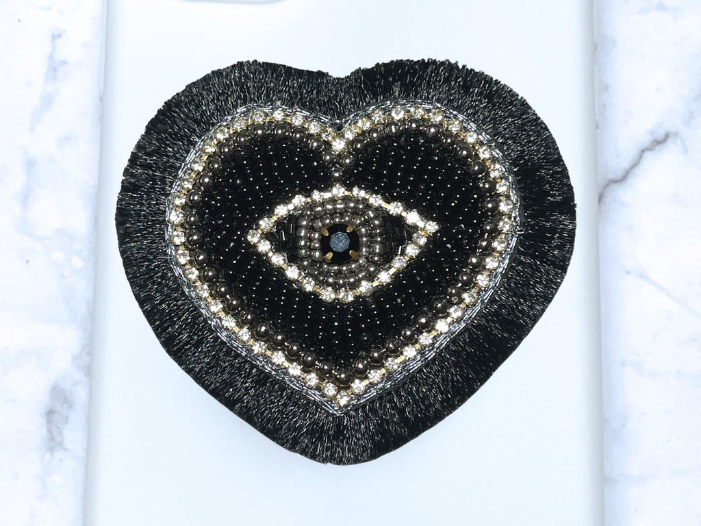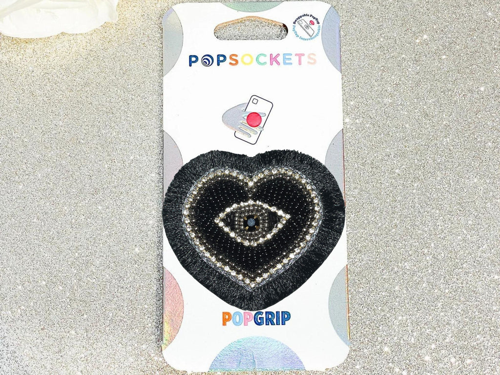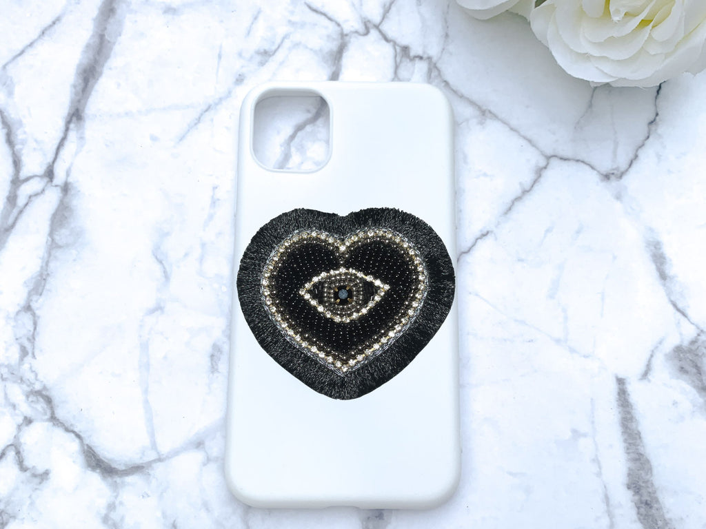 Black Beaded Rhinestone Heart Evil Eye with Fringe Phone Popsocket