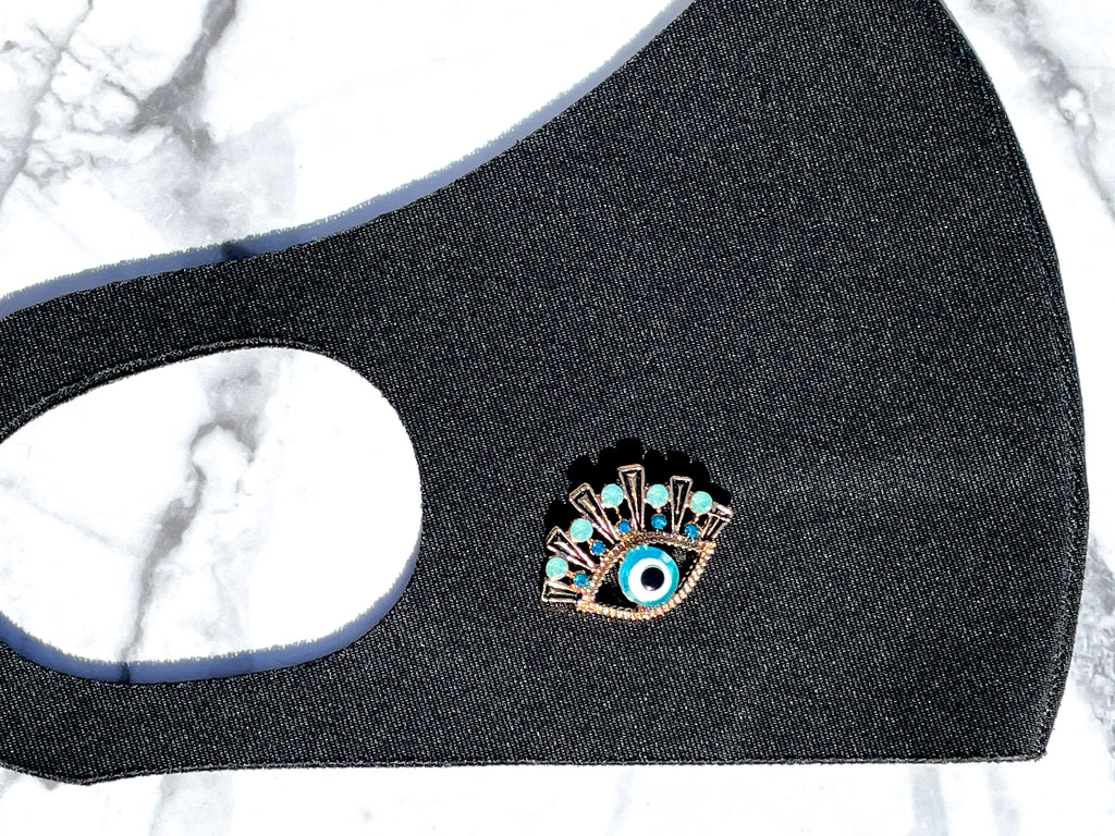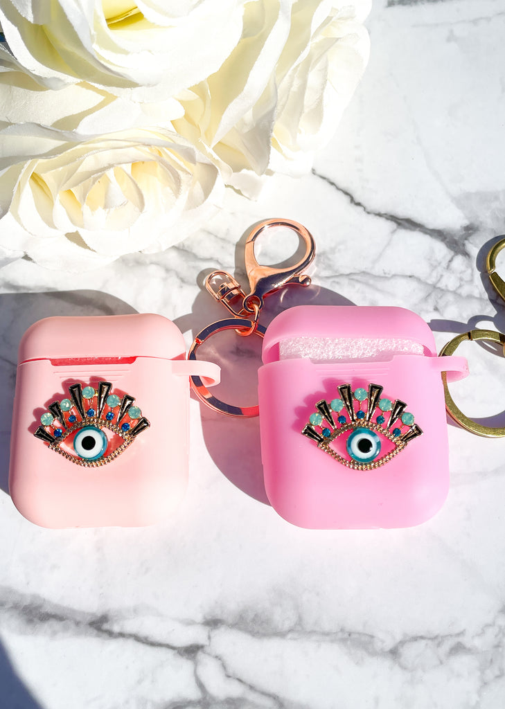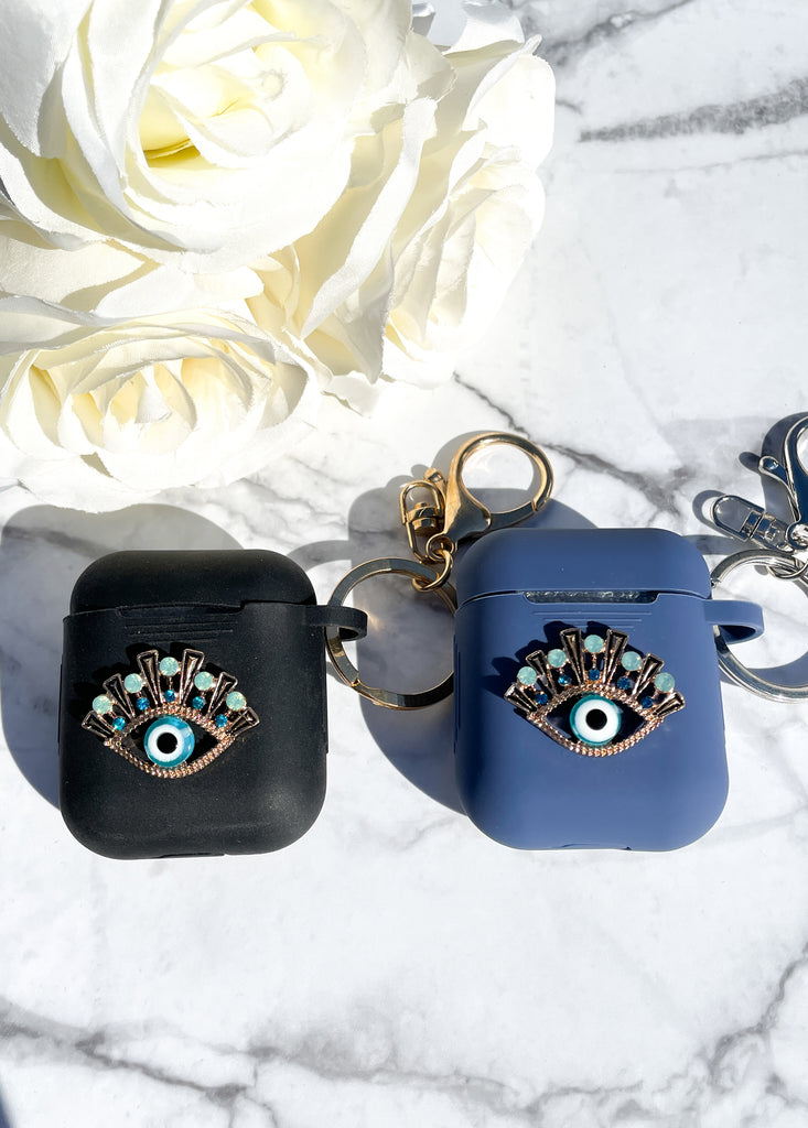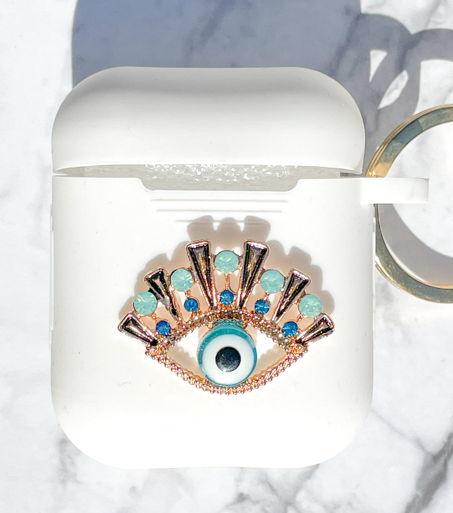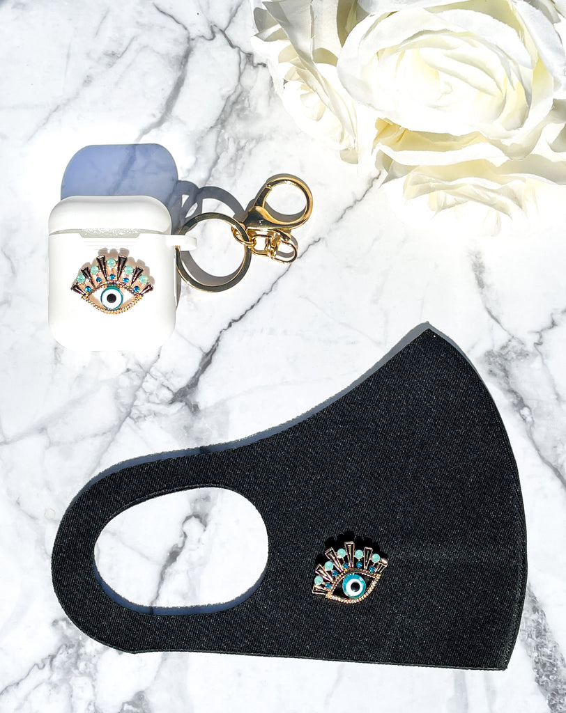 Gold and Turquoise Rhinestones Evil Eye AirPods Case and Face Mask 2