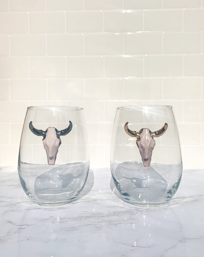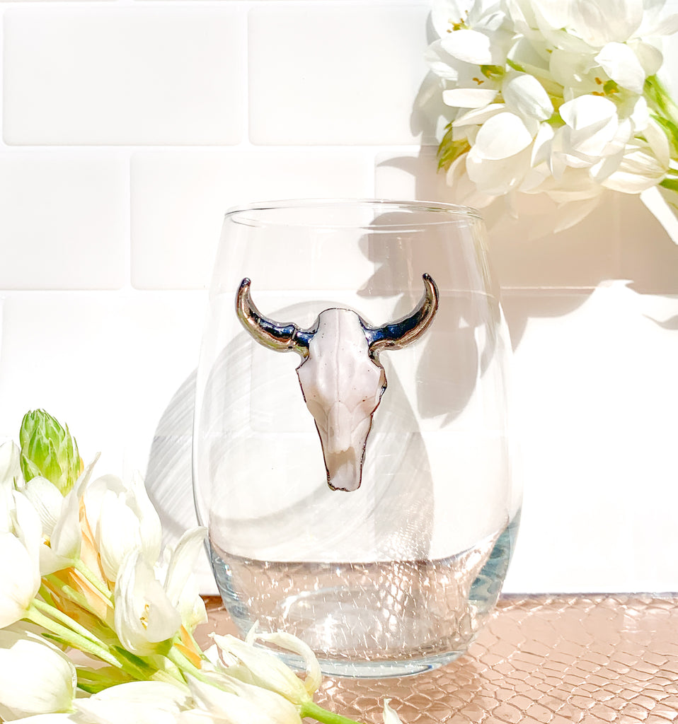 Gunmetal Silver & White Longhorn Skull Stemless Wine Glass
