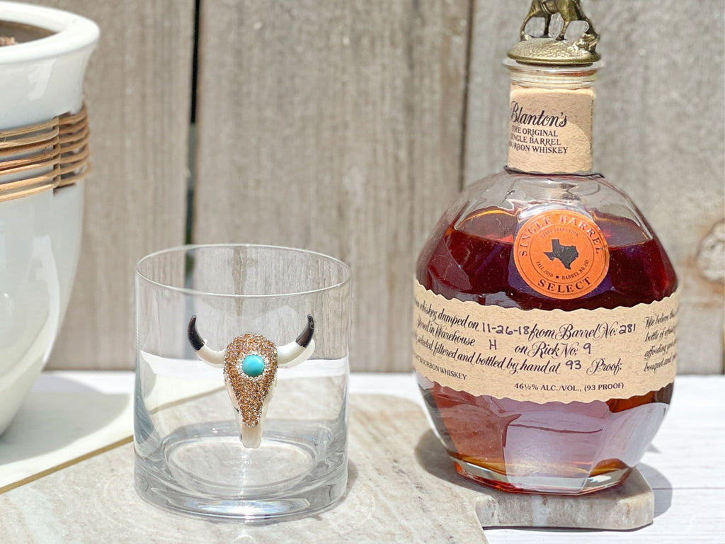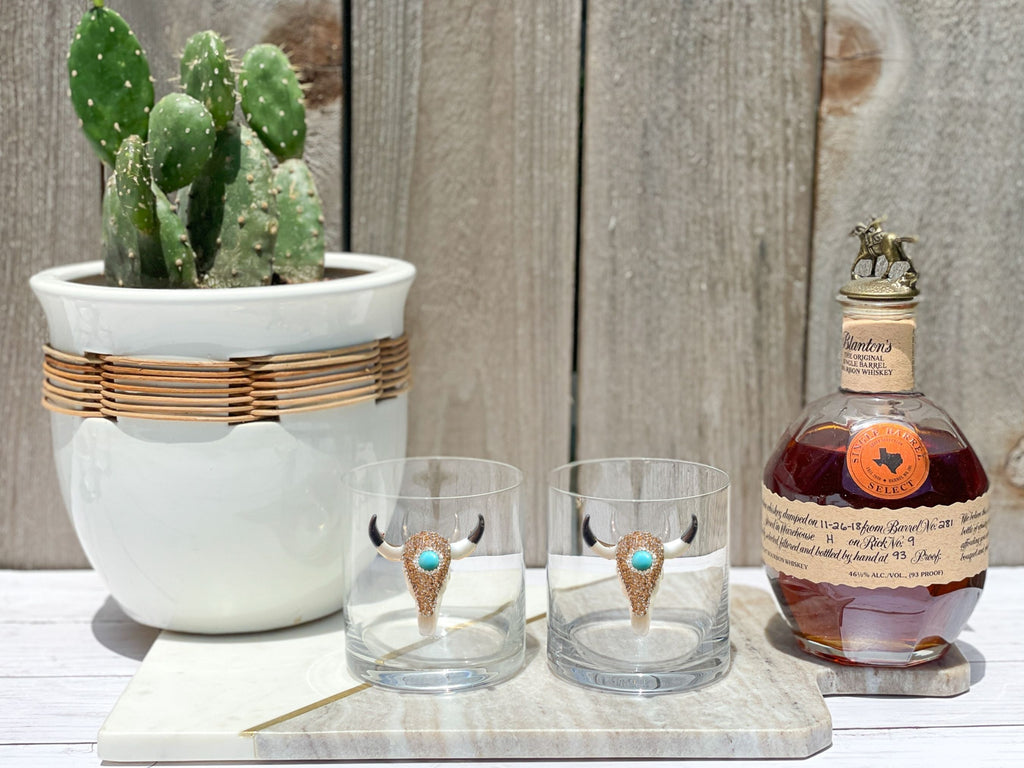 Turquoise and Rose Gold Rhinestones Longhorn Skull Whiskey / Old Fashion Glasses