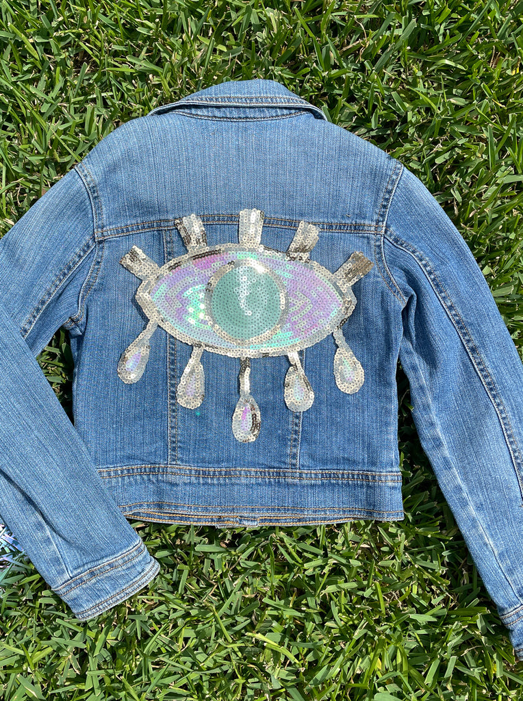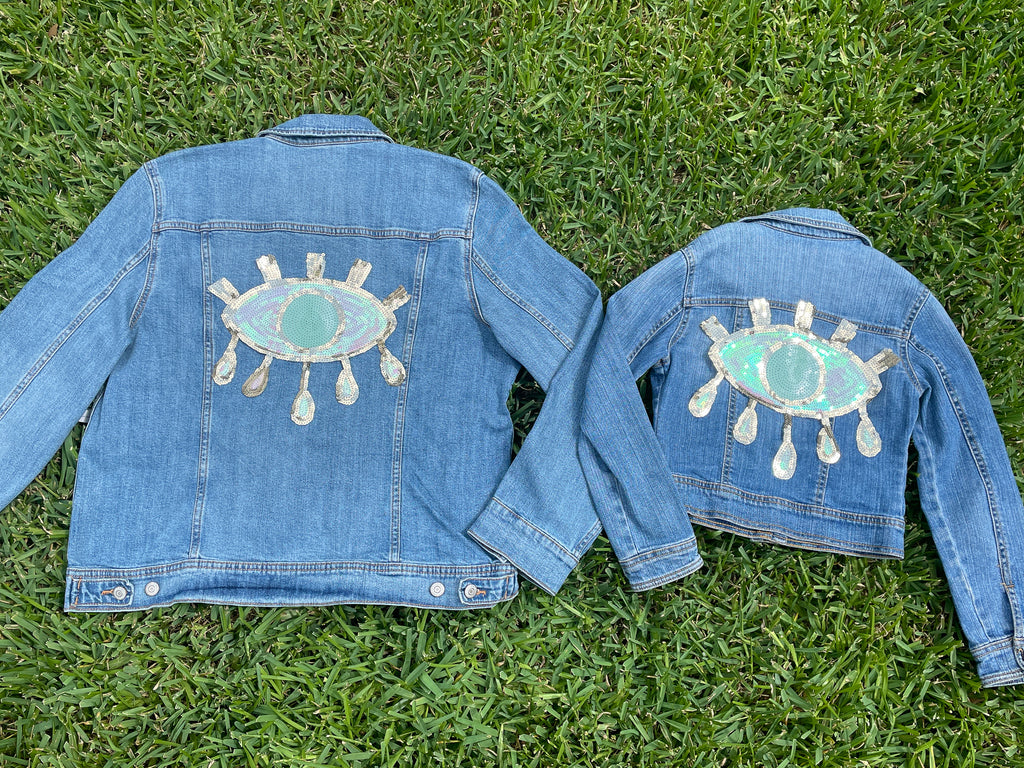 Mom and Mini Iridescent Pink, Gold and Green Sequin Evil Eye Jean Jacket