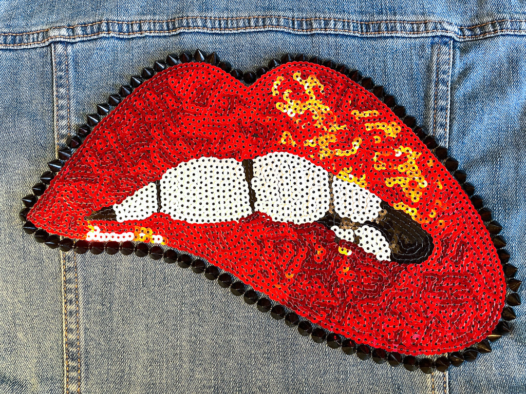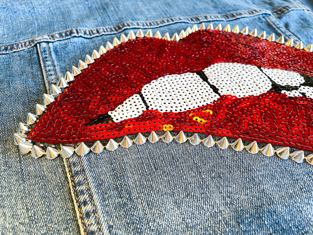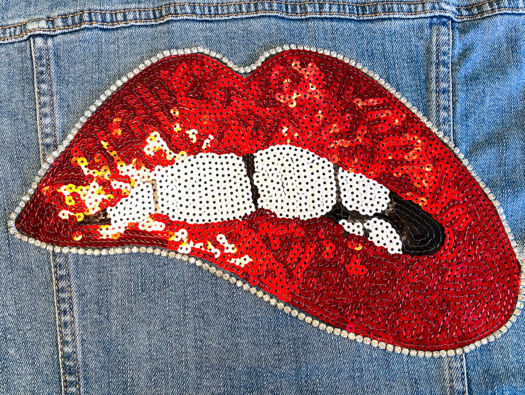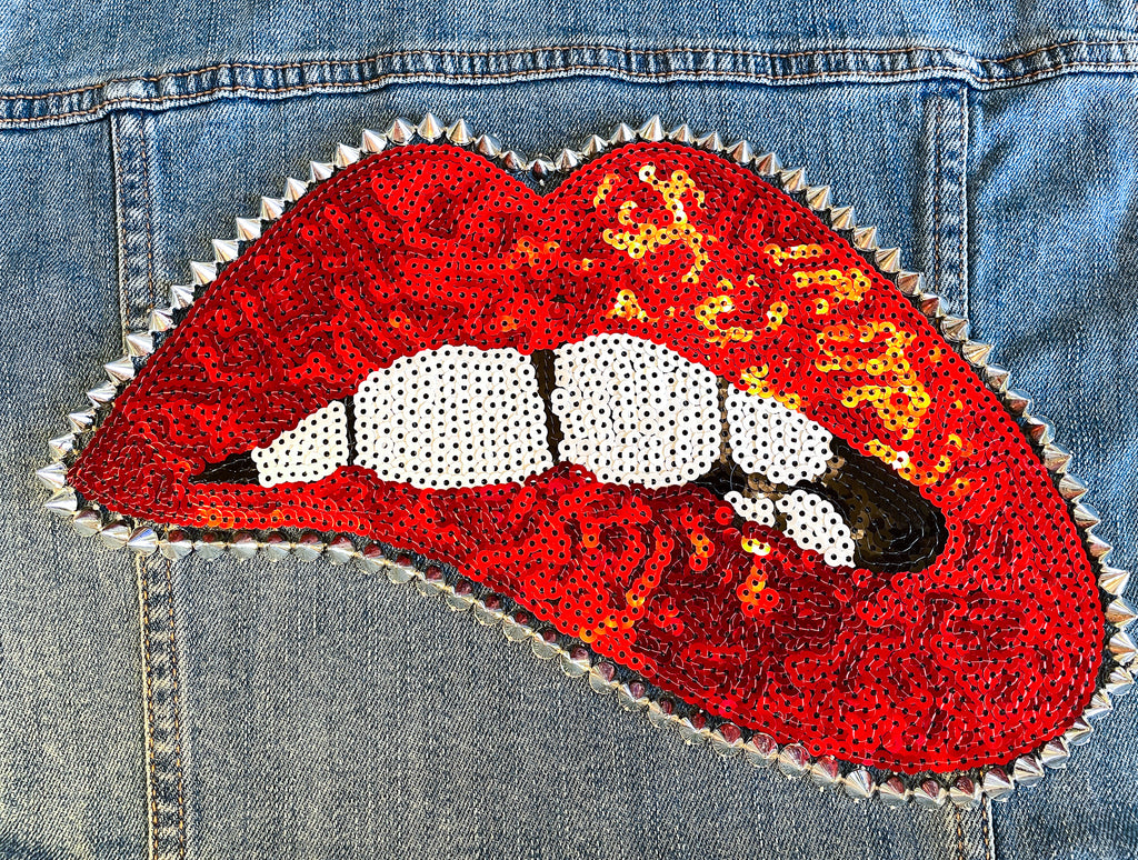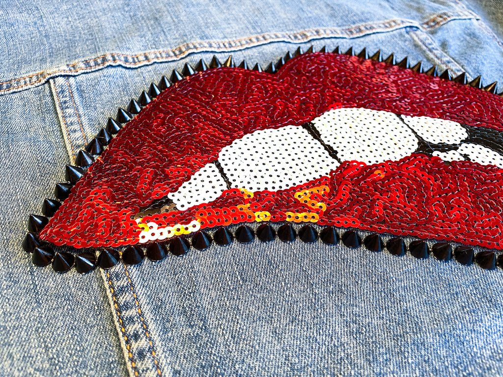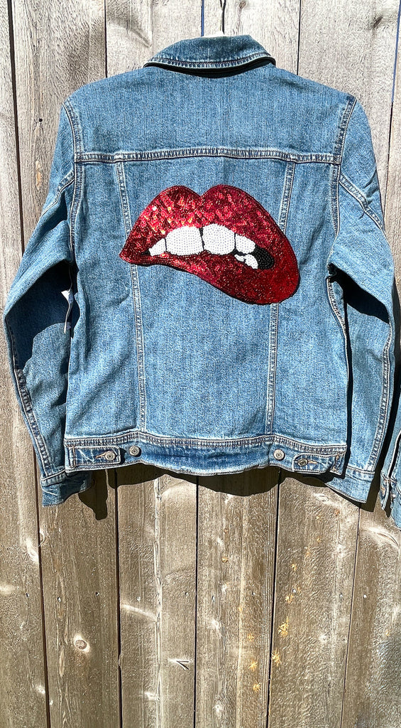 β¨π This is your perfect jacket! Unique and glamorous, make a statement with your sequinΒ lip jean jacket and instantly add some flare to any outfit πβ¨