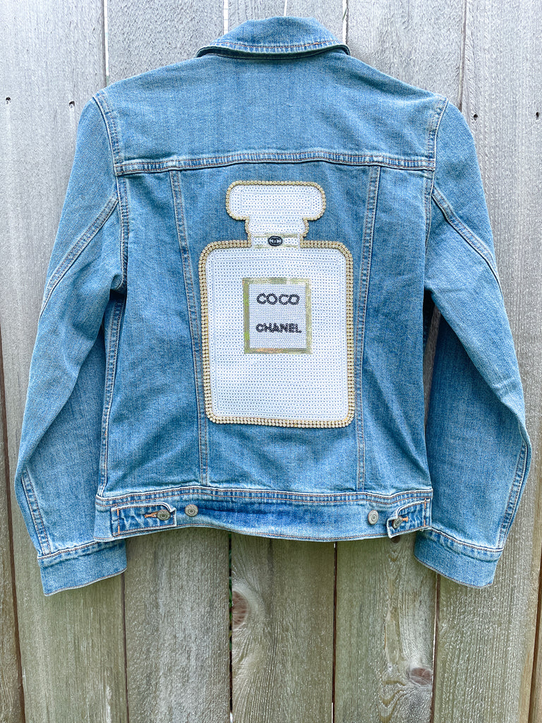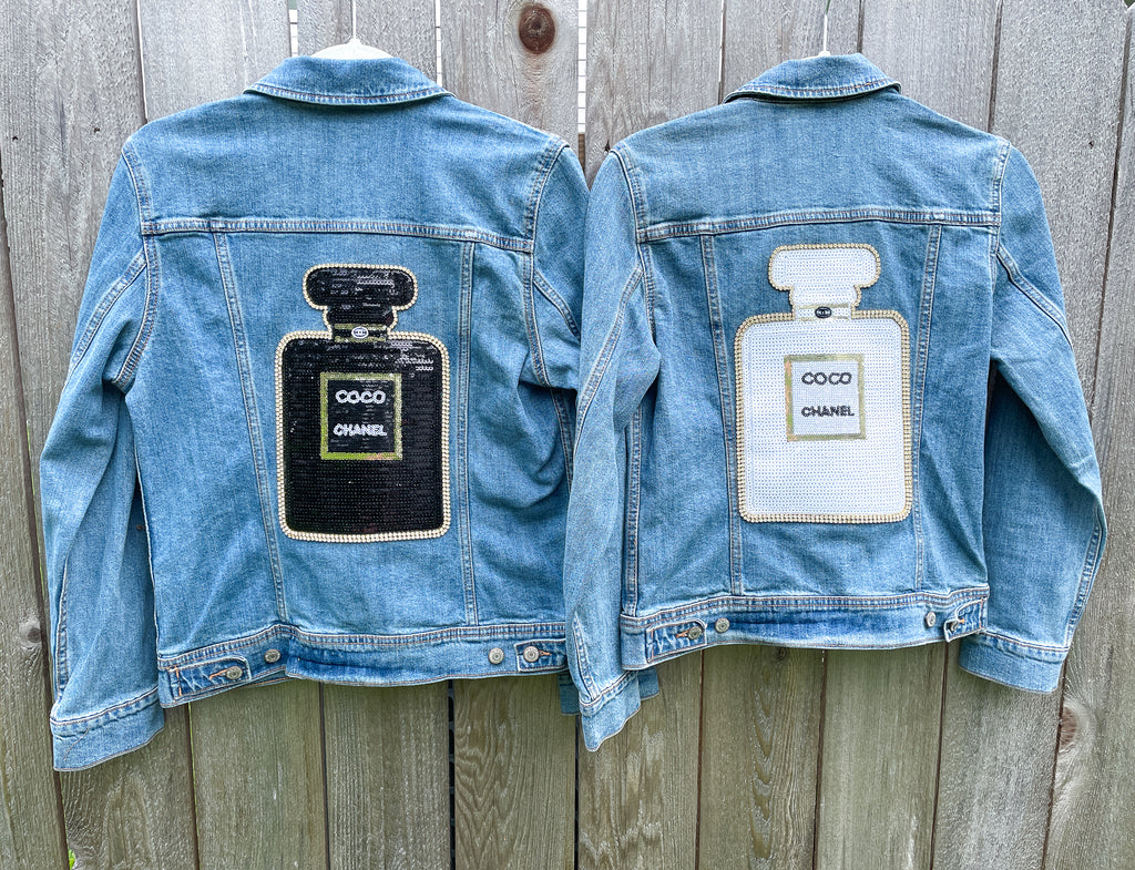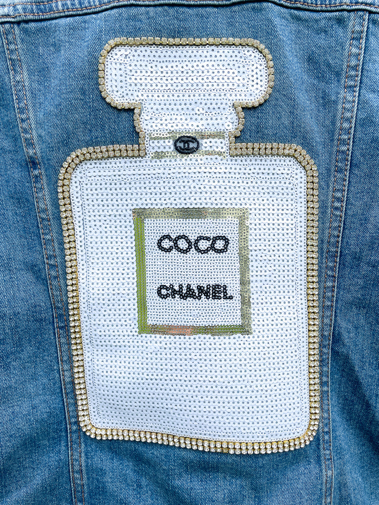 White and Gold Sequin Perfume Bottle Jean Jacket