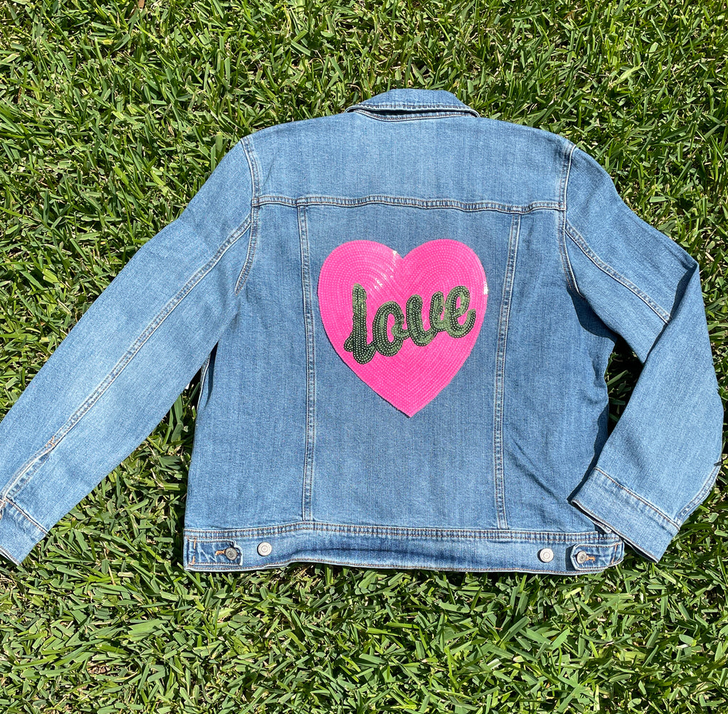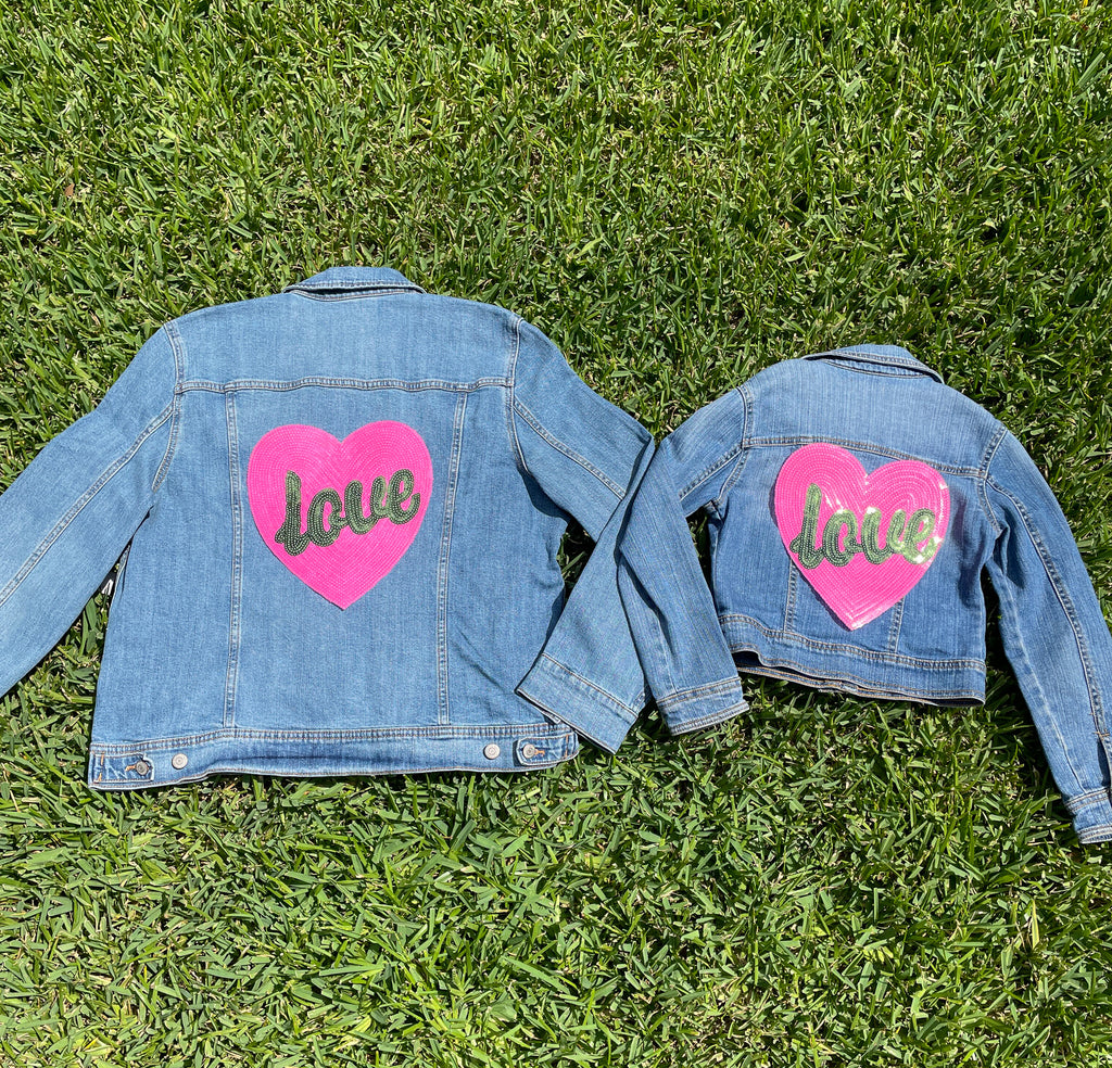 Mom and Mini Sequin Pink Heart with Green LOVE Jean Jacket
