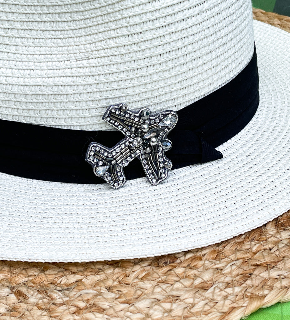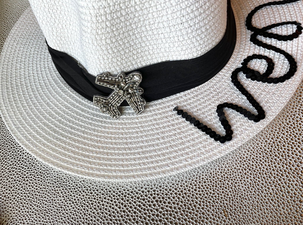 Hat 1: White hat, black sequin "Wendy One" with silver airplane