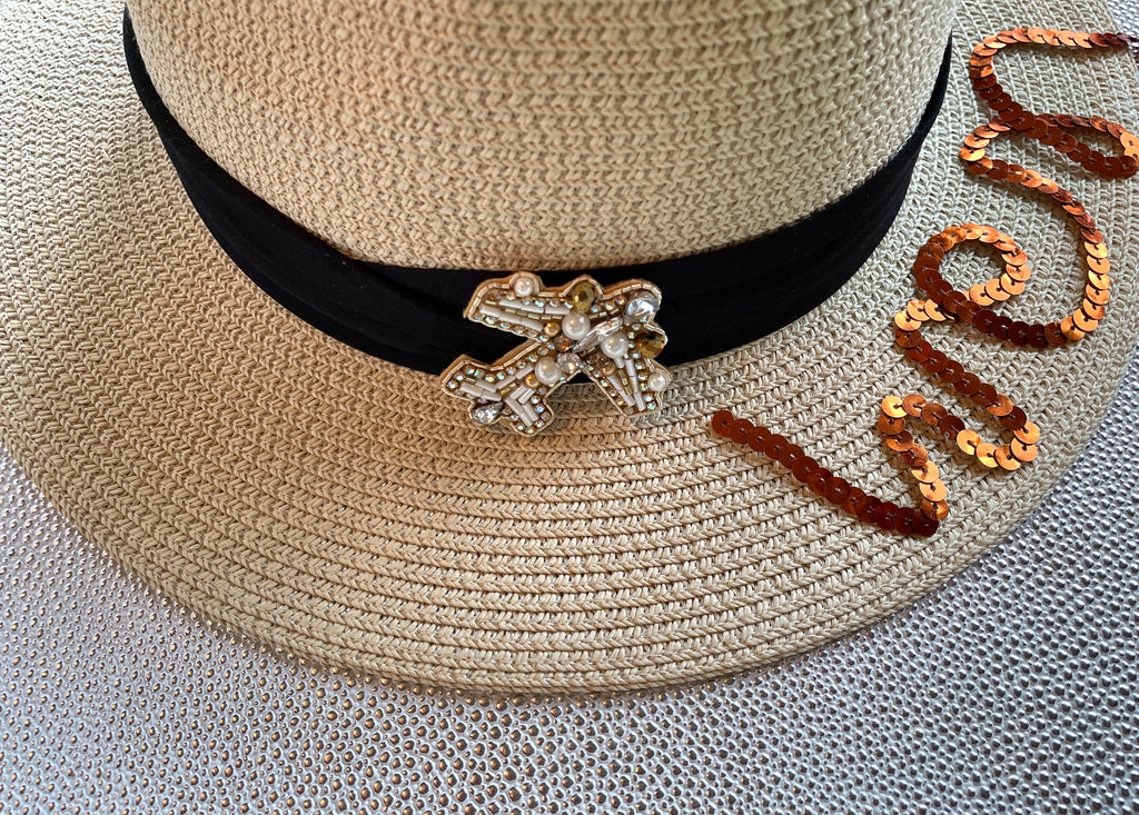 Hat 2: Tan hat, UT orange sequin "Wendy One" with silver plane
