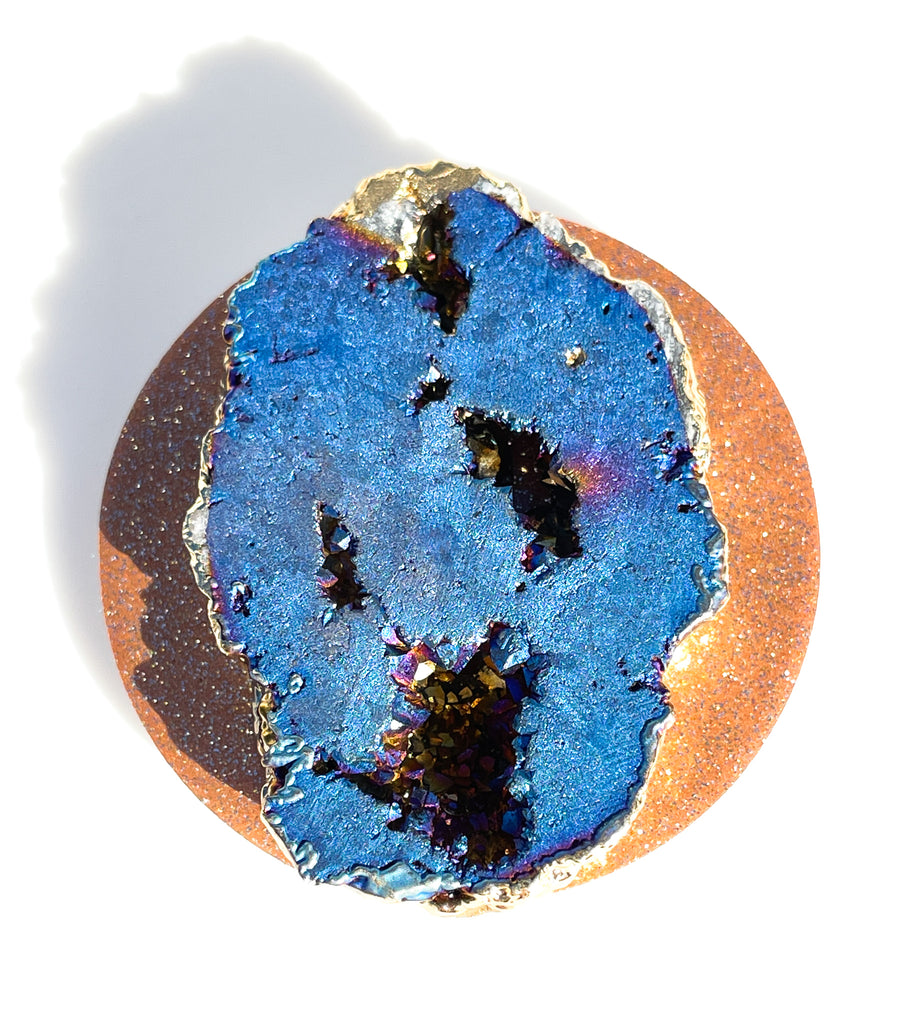 Sapphire Blue Iridescent Druzy Geode Crystal Gold Edged with Rainbow AB Shine Phone Popsocket