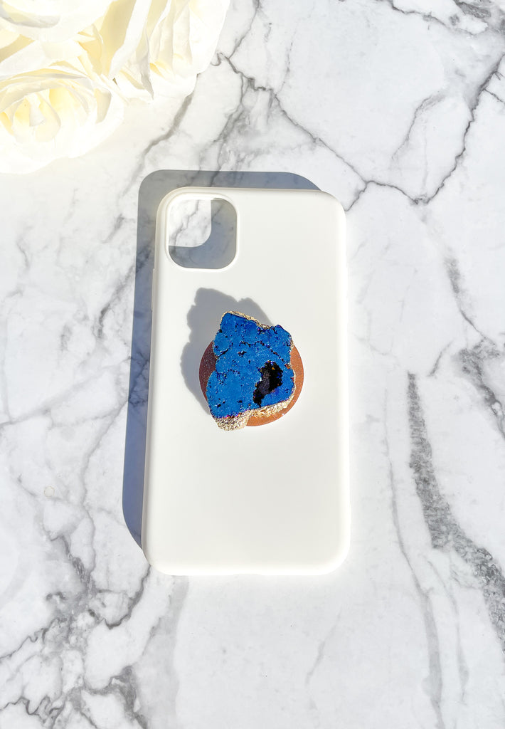 Sapphire Blue Iridescent Druzy Geode Crystal Gold Edged Phone Popsocket 1