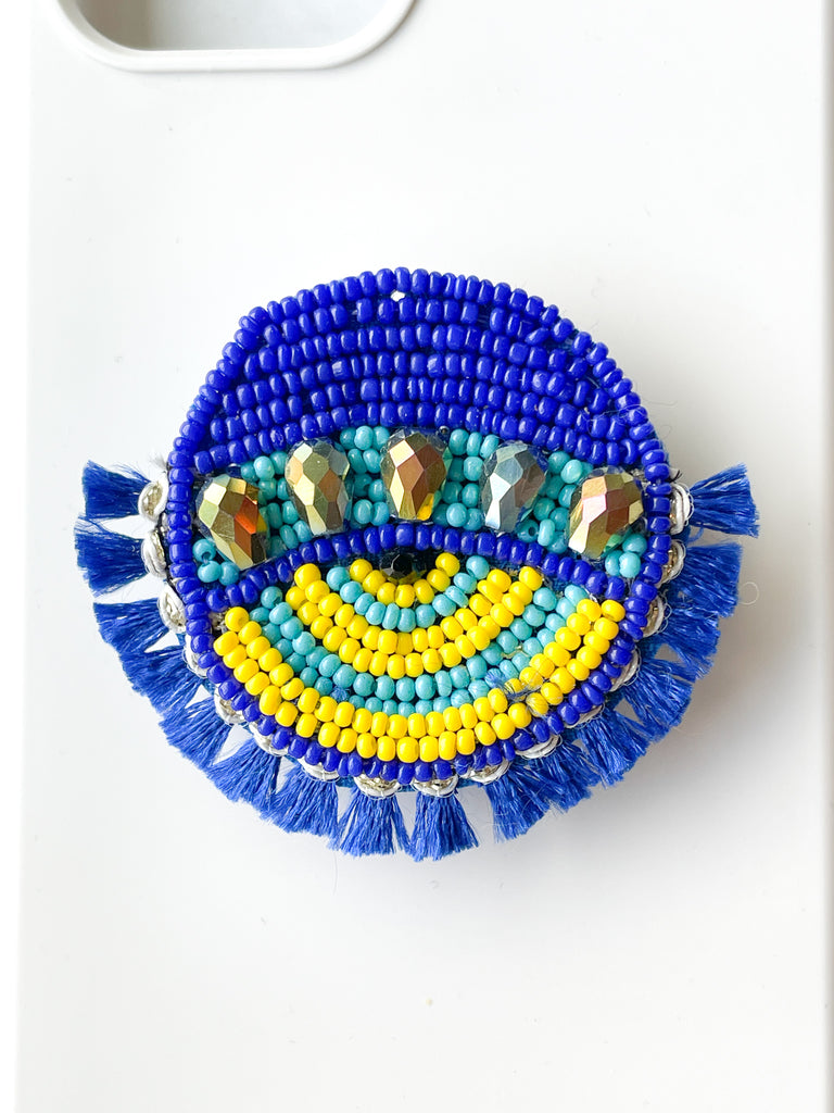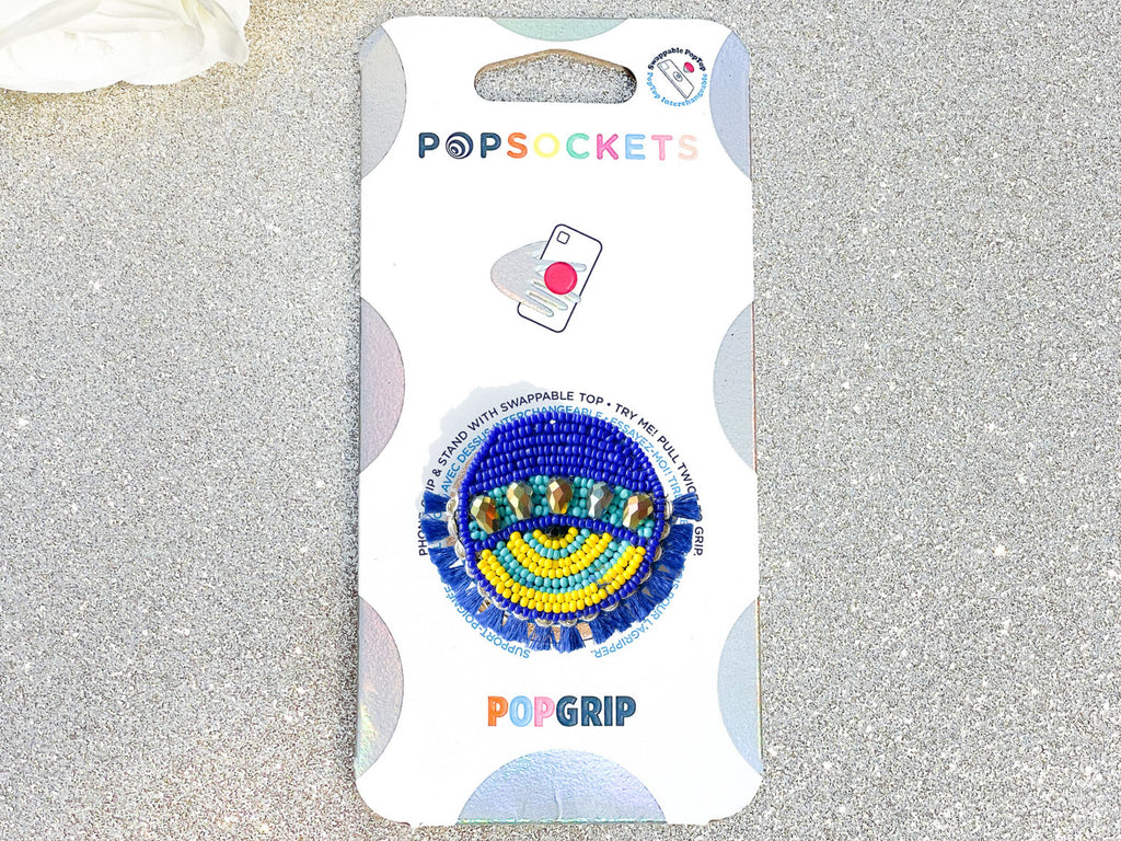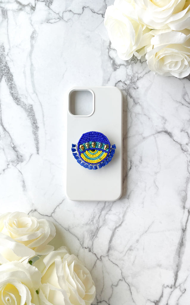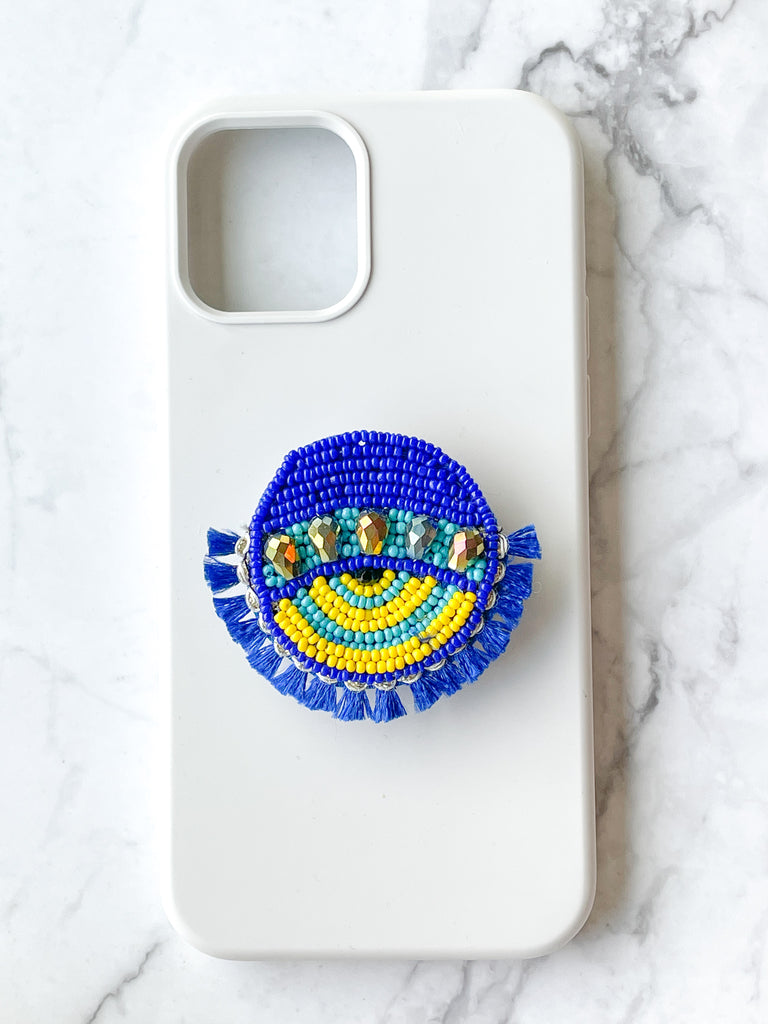 Blue, Yellow, Turquoise & Mermaid Beaded Evil Eye with Fringe Phone Popsocket