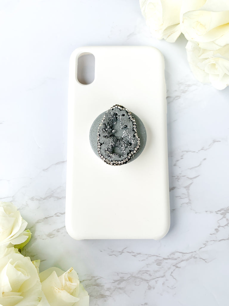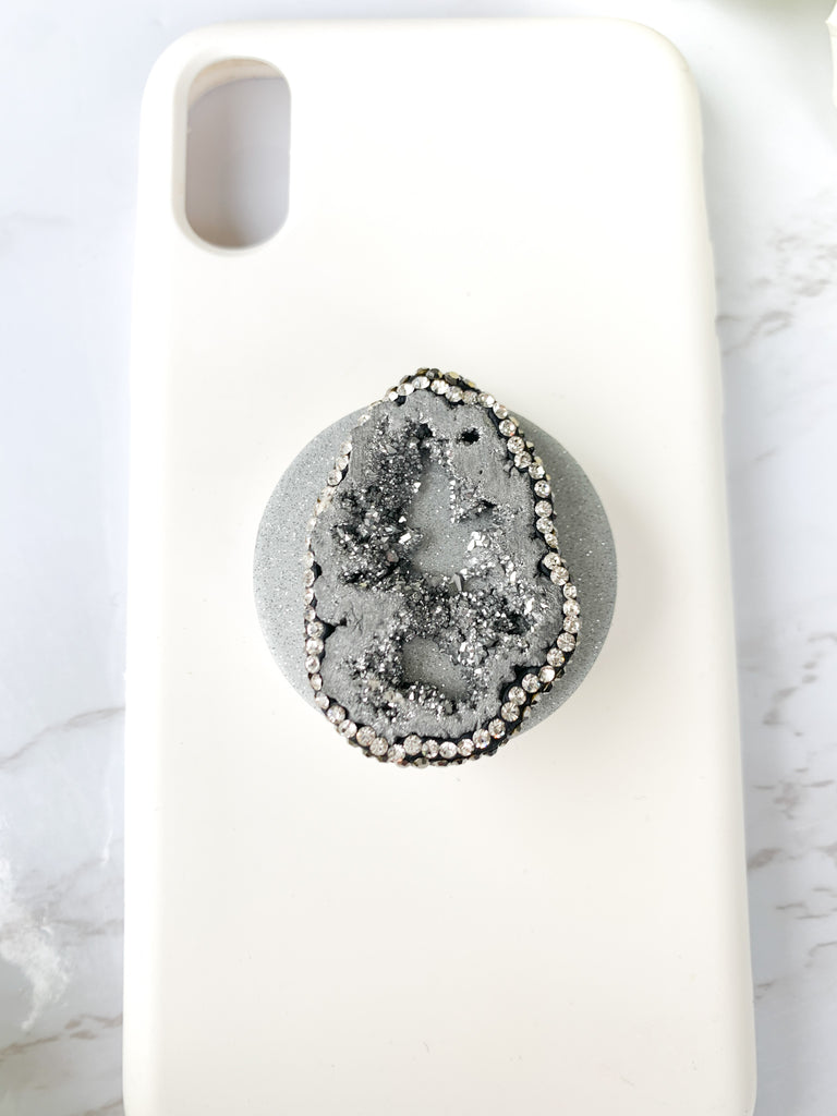 Pyrite Silver Druzy Geode Crystal Rhinestone Edged Phone Popsocket