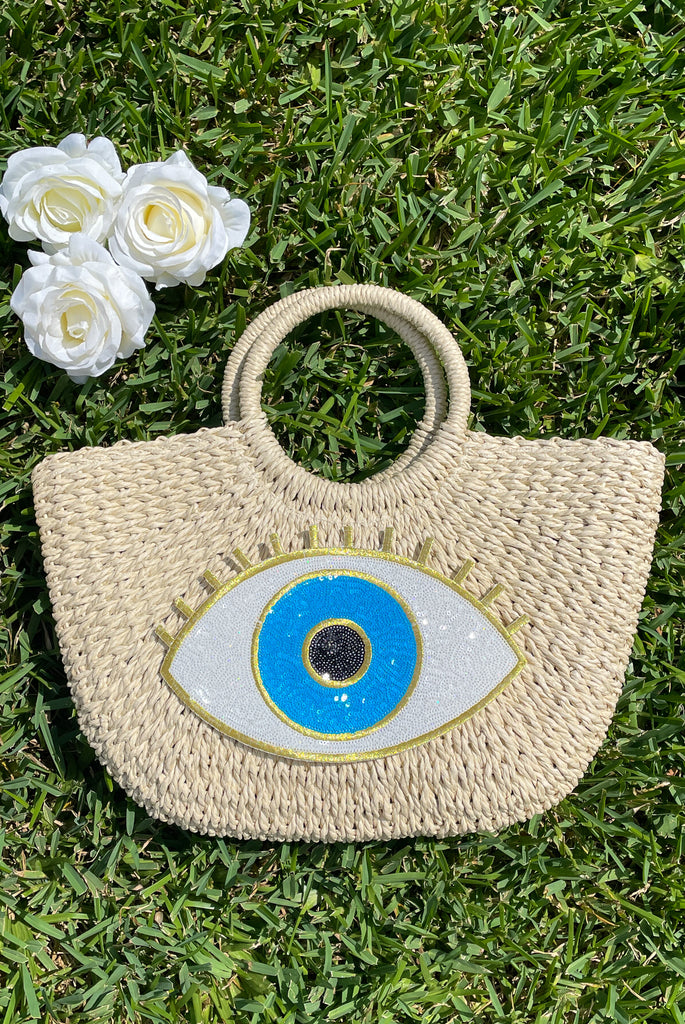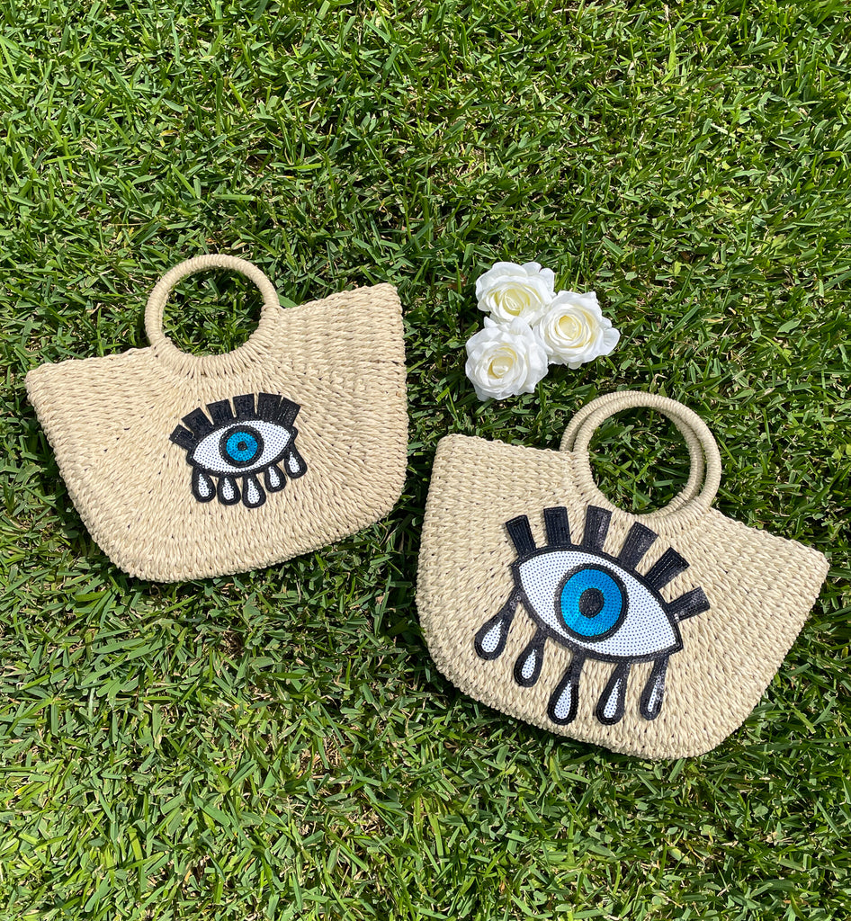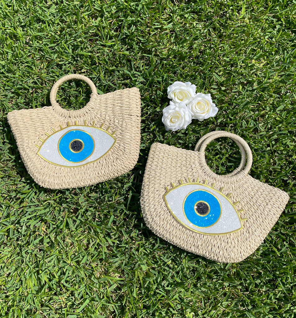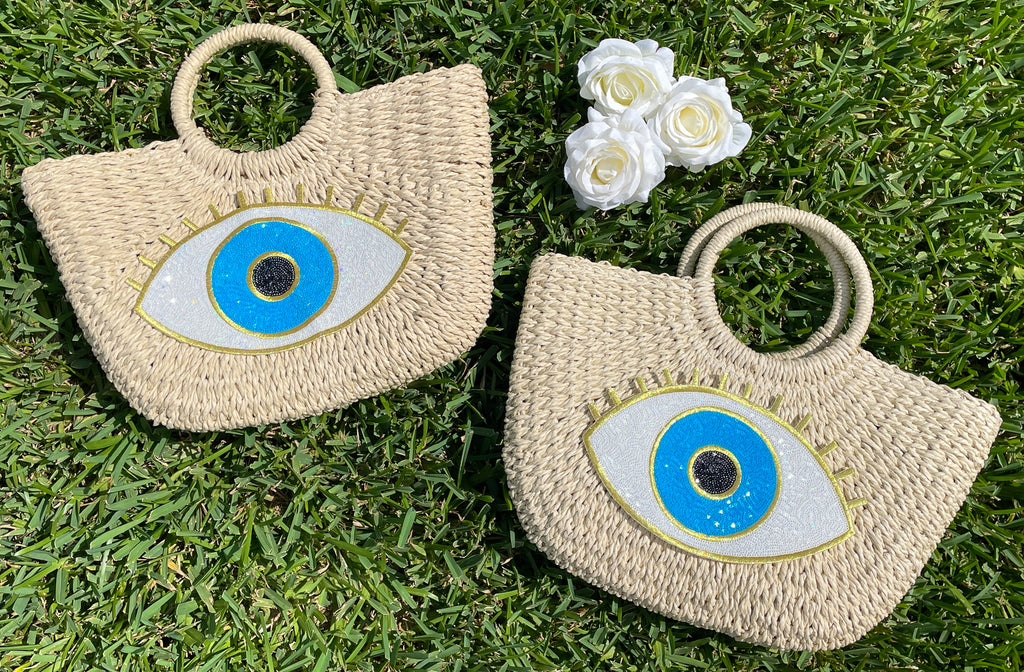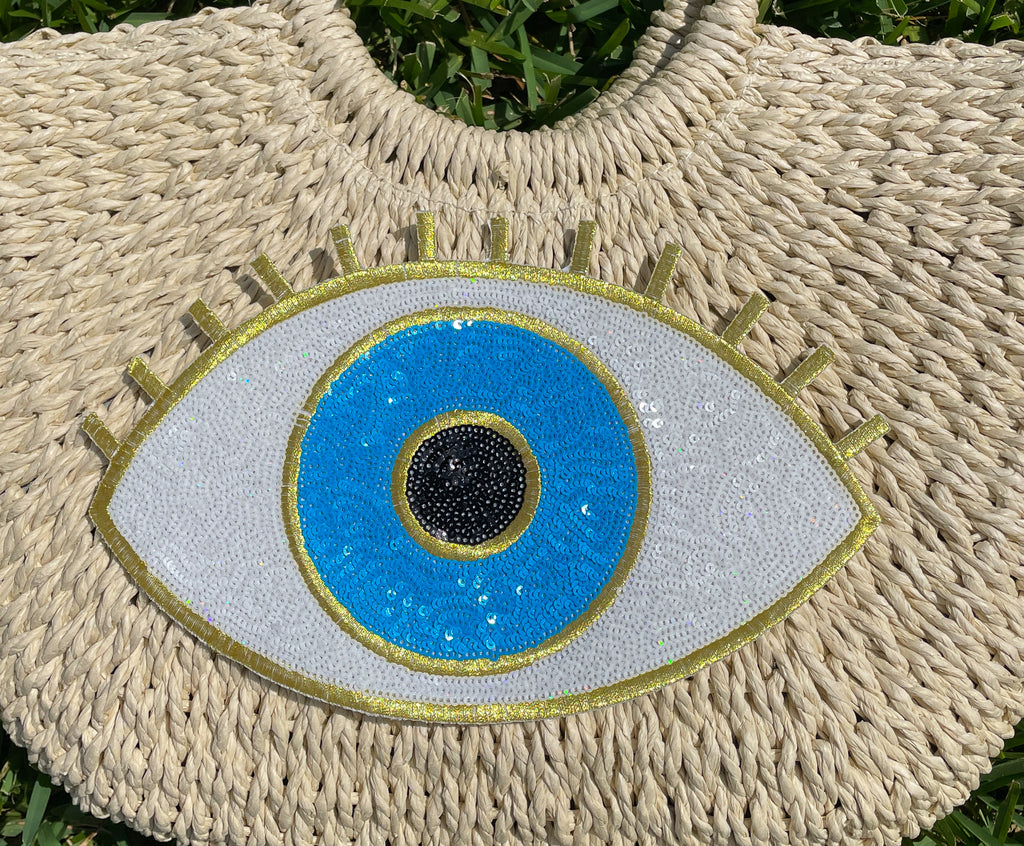 Gold & Blue Sequin Evil Eye Straw Beach Bag