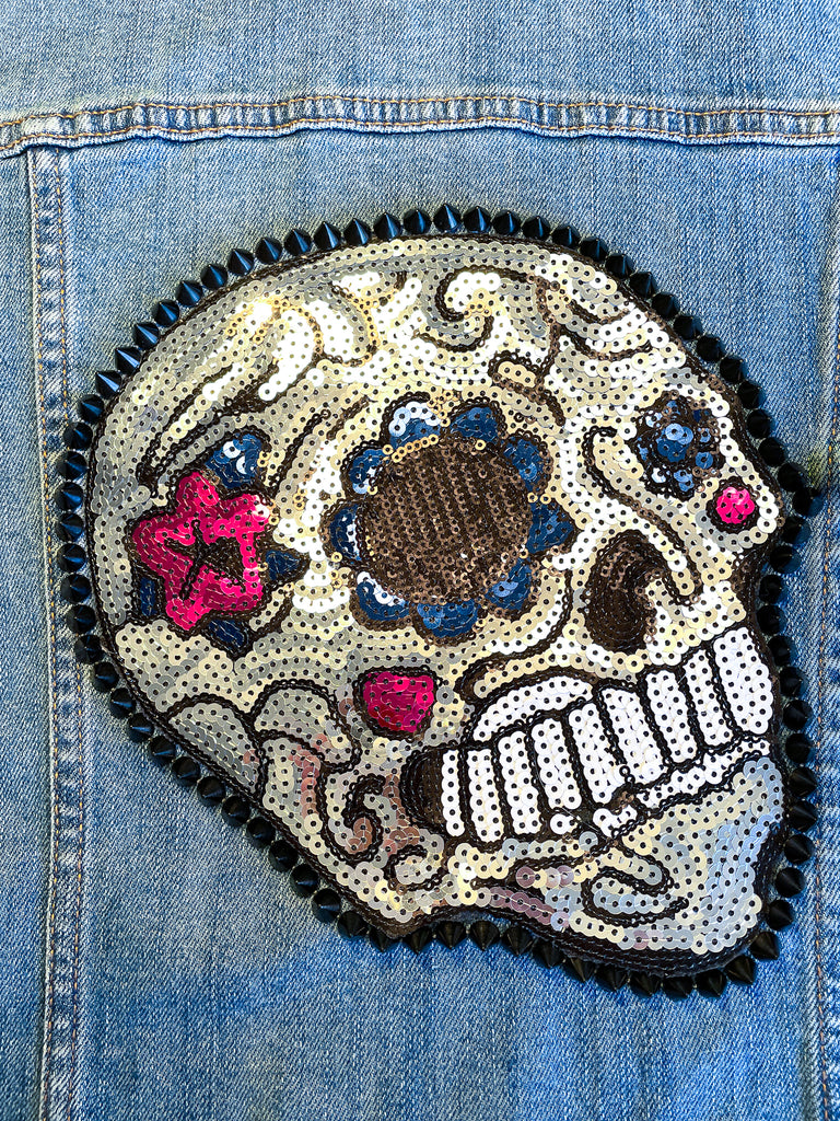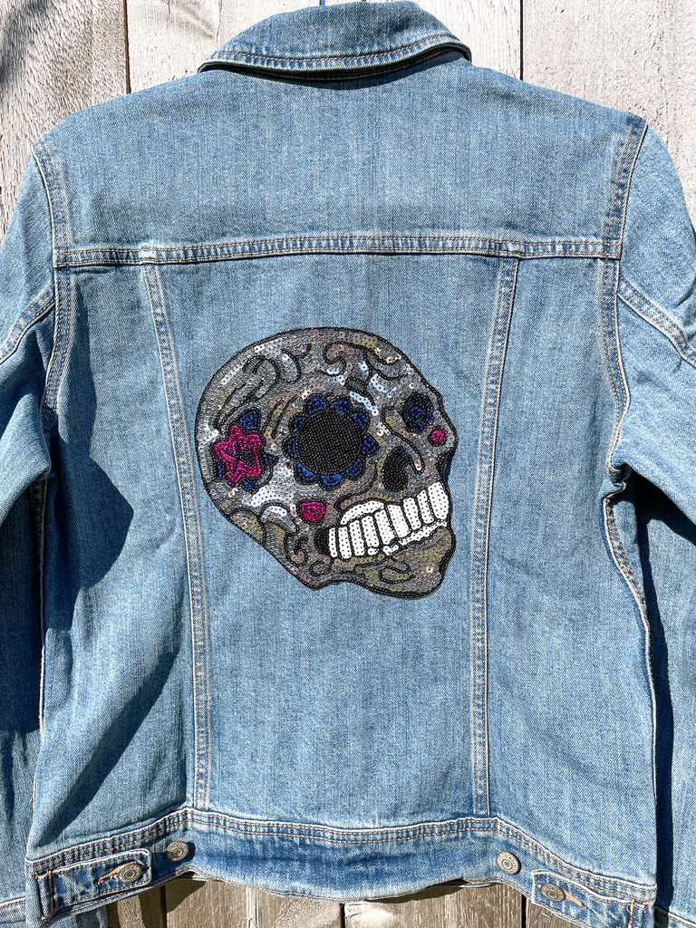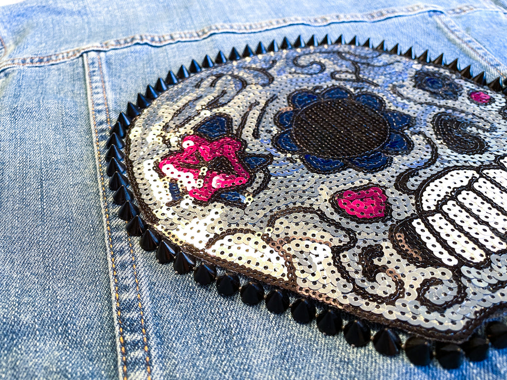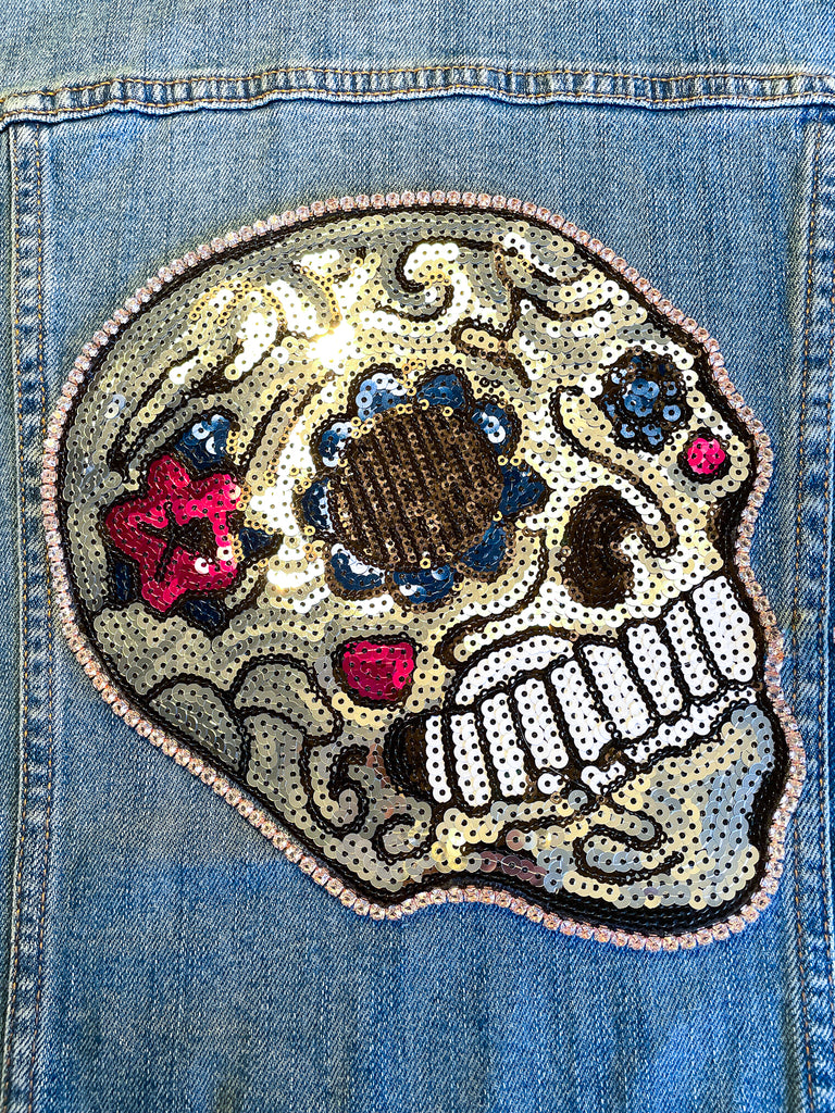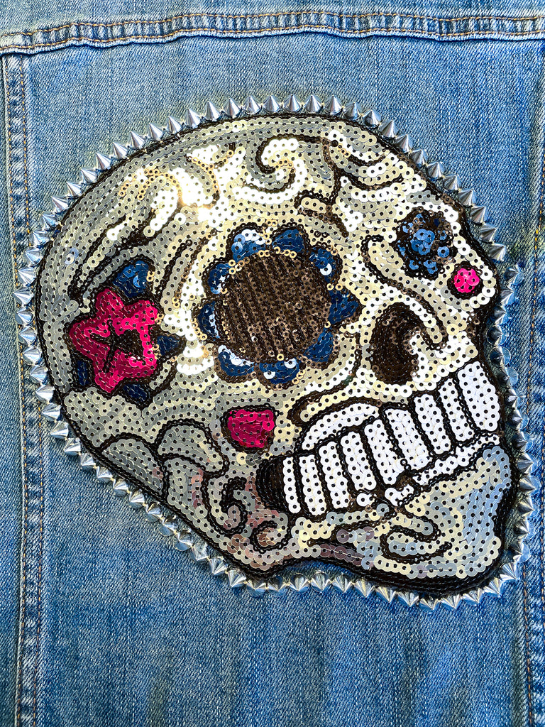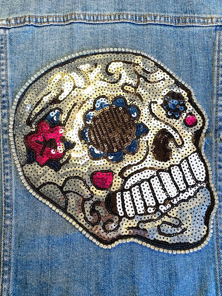 Custom Sequin Skull with Flowers Jean Jacket