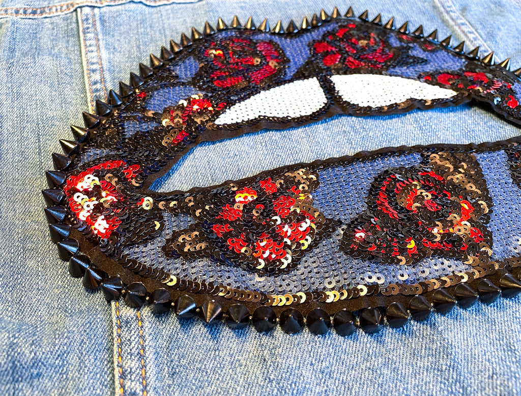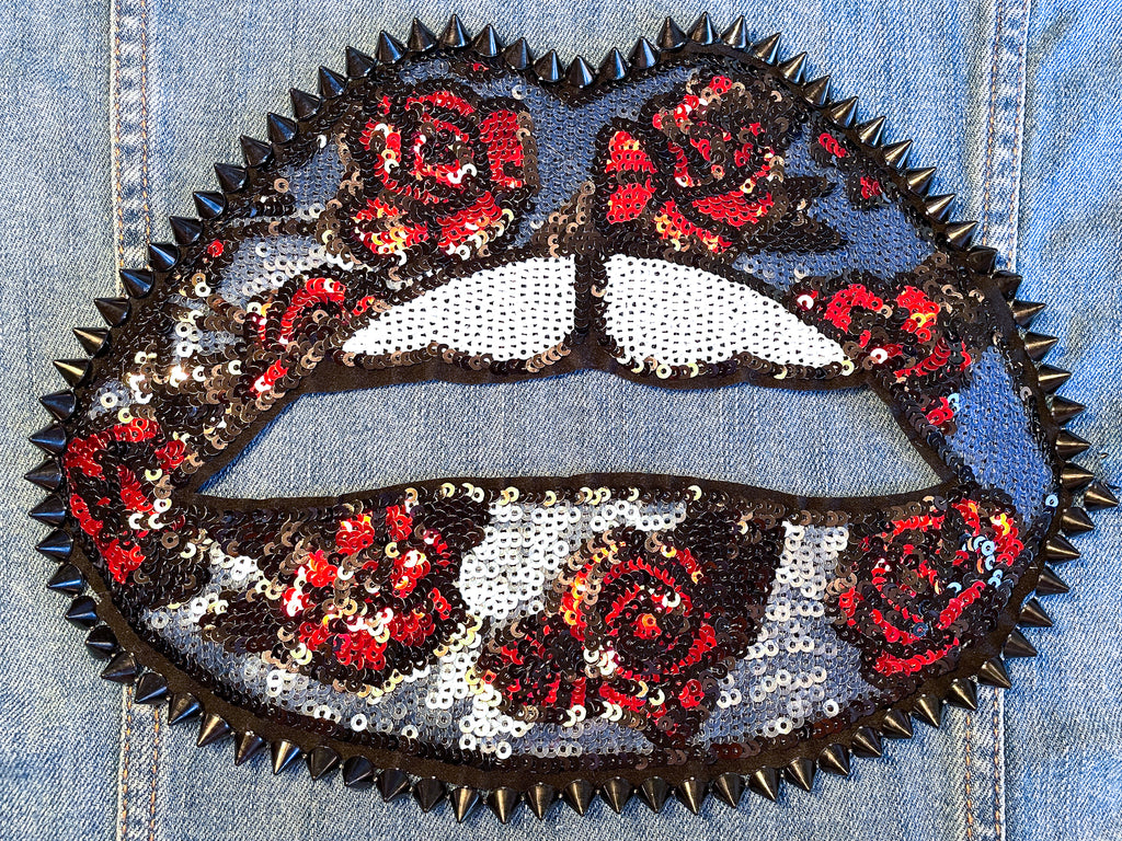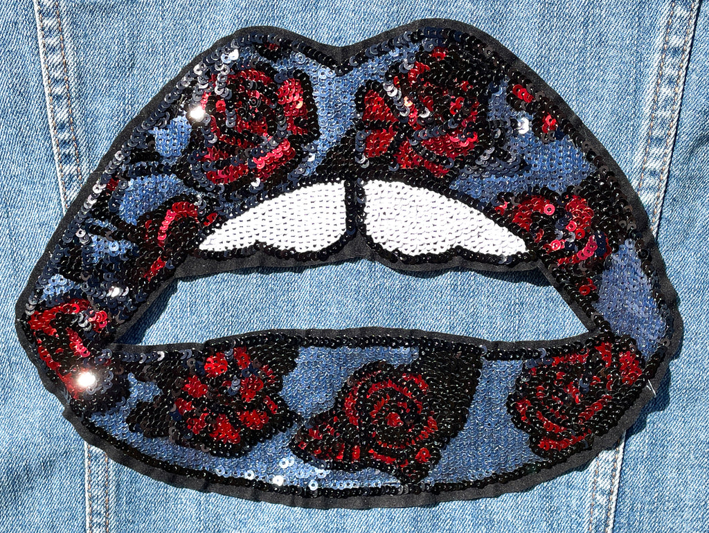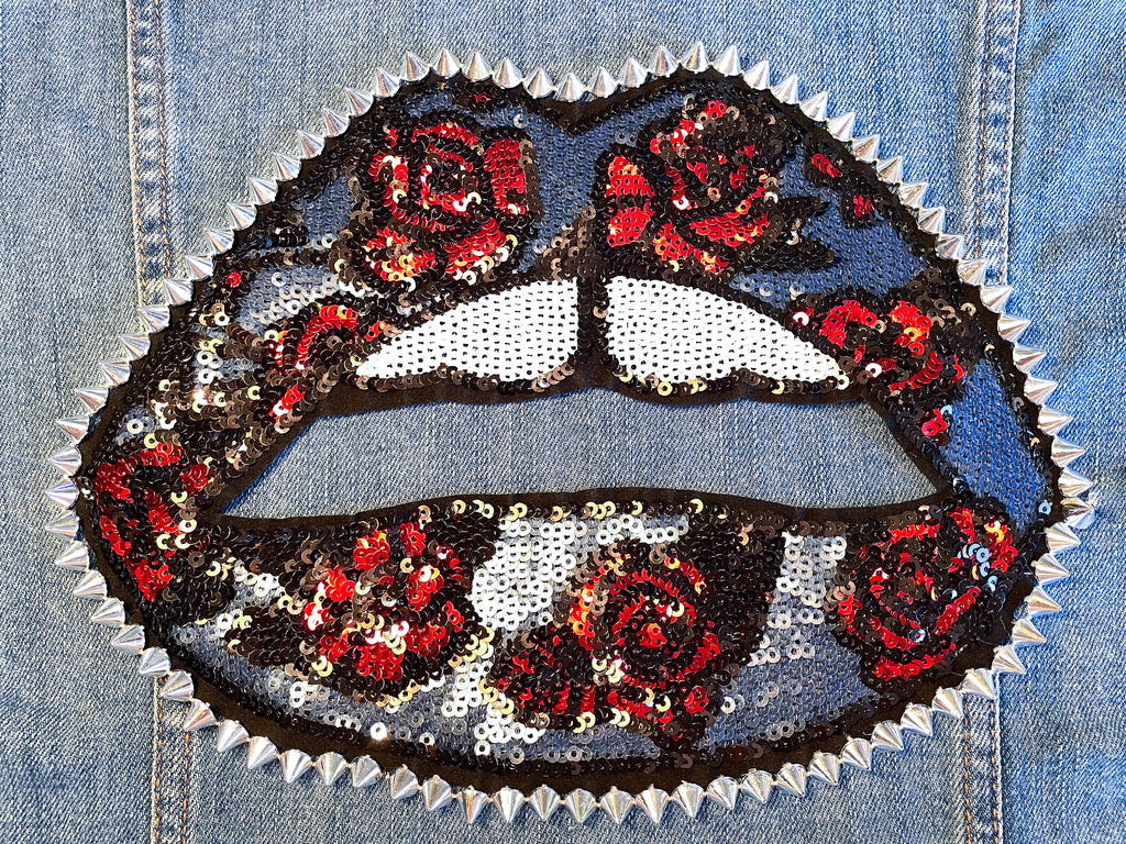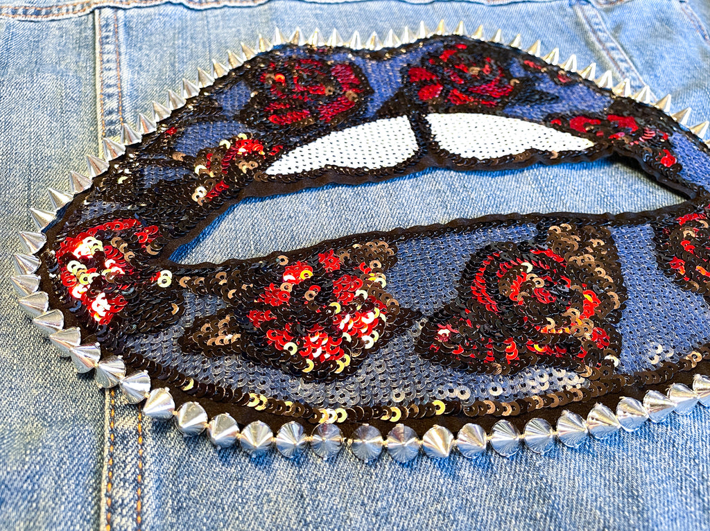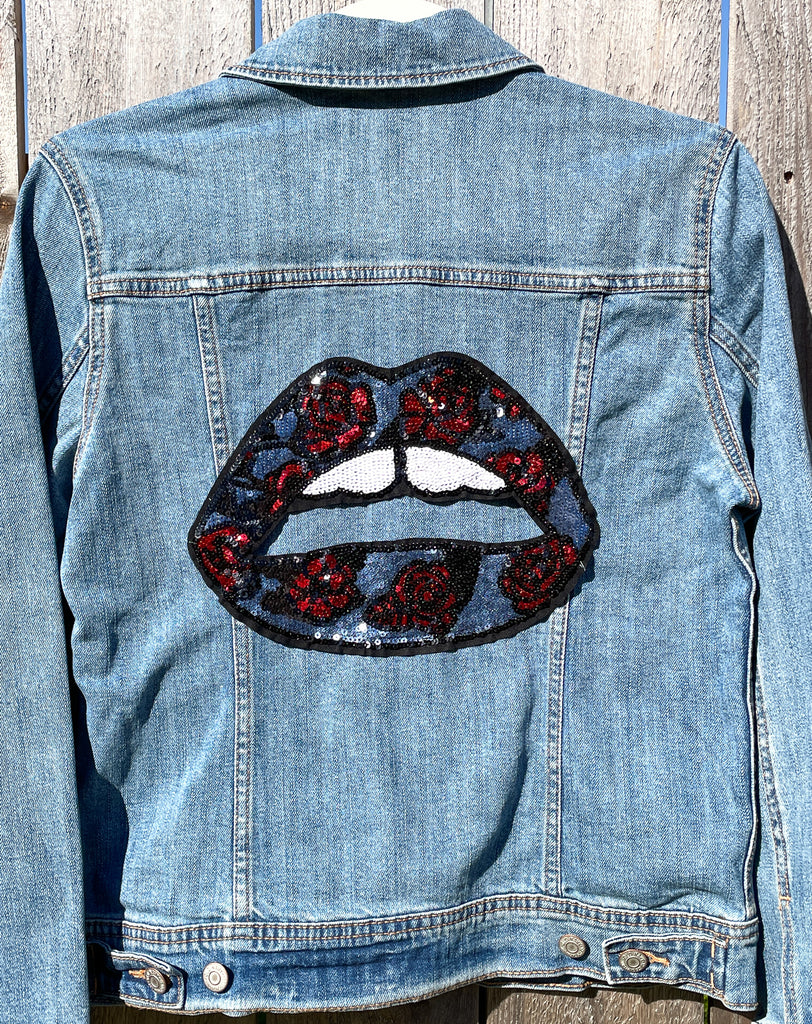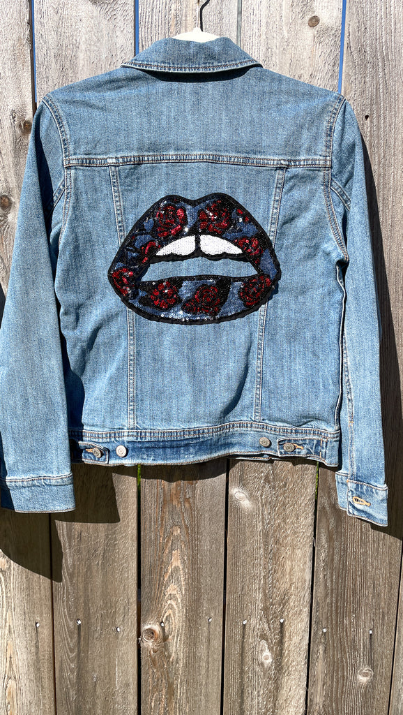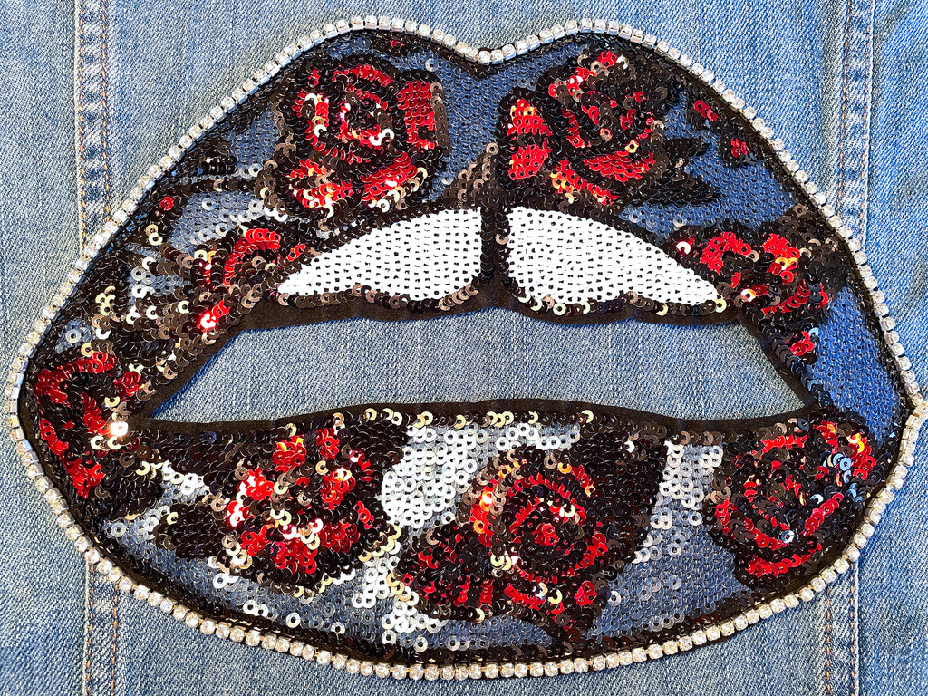 Custom Sequin Lips with Roses Jean Jacket