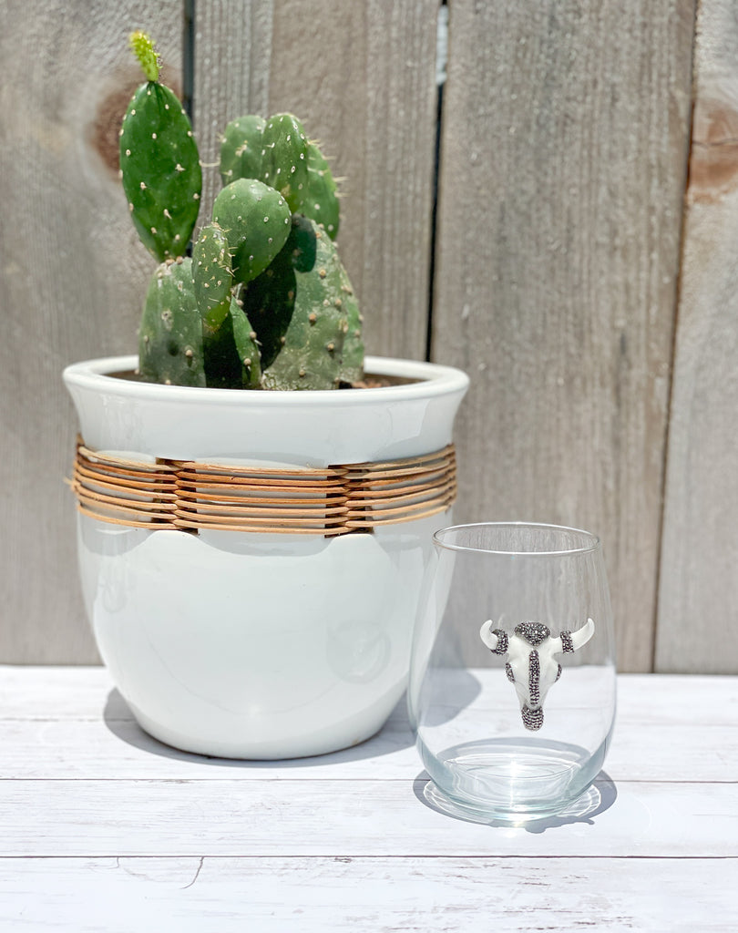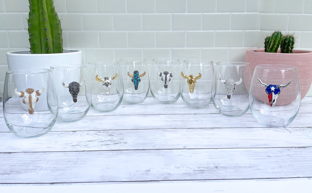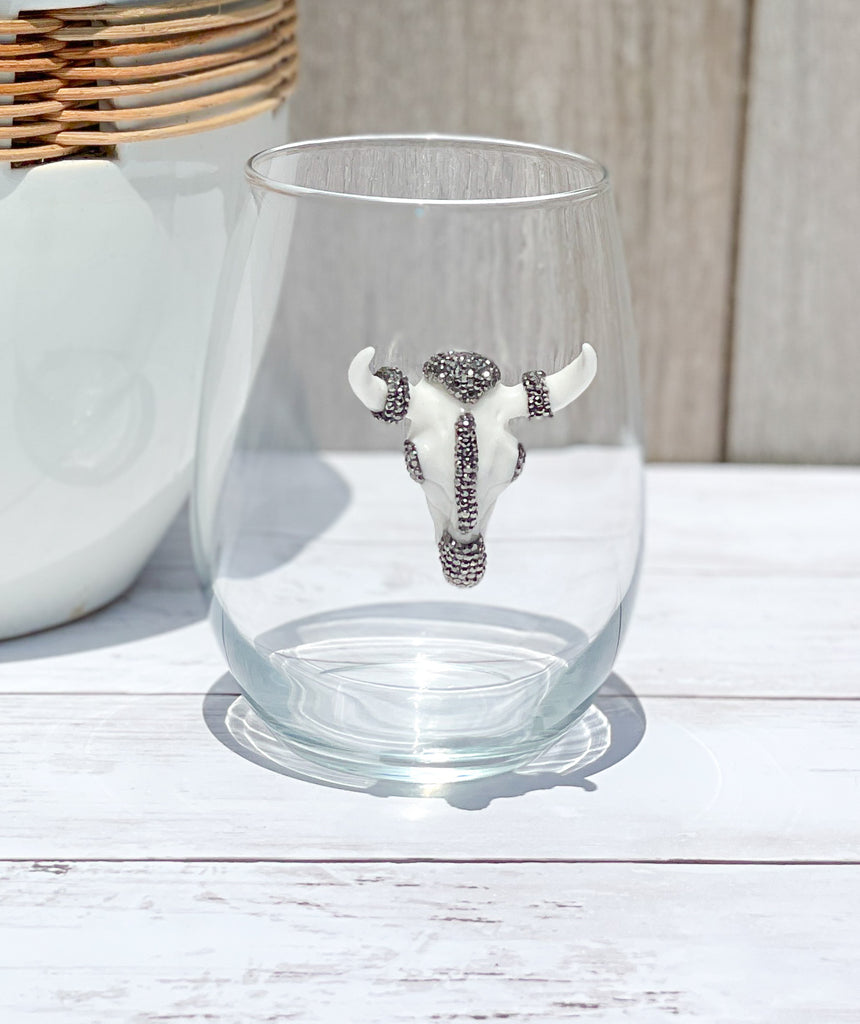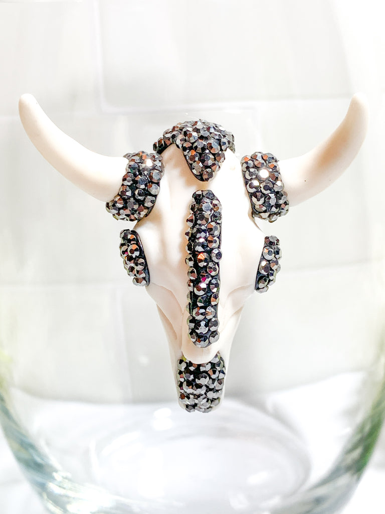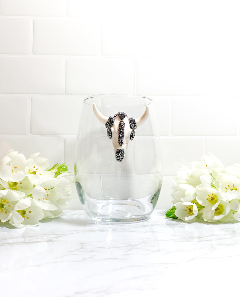 Ivory & Gunmetal Rhinestones Longhorn Skull Stemless Wine Glass