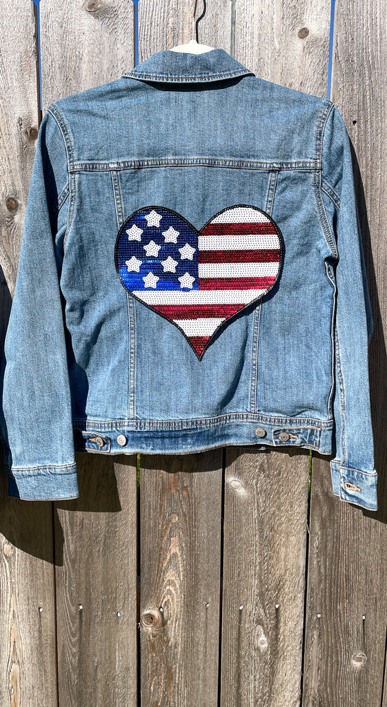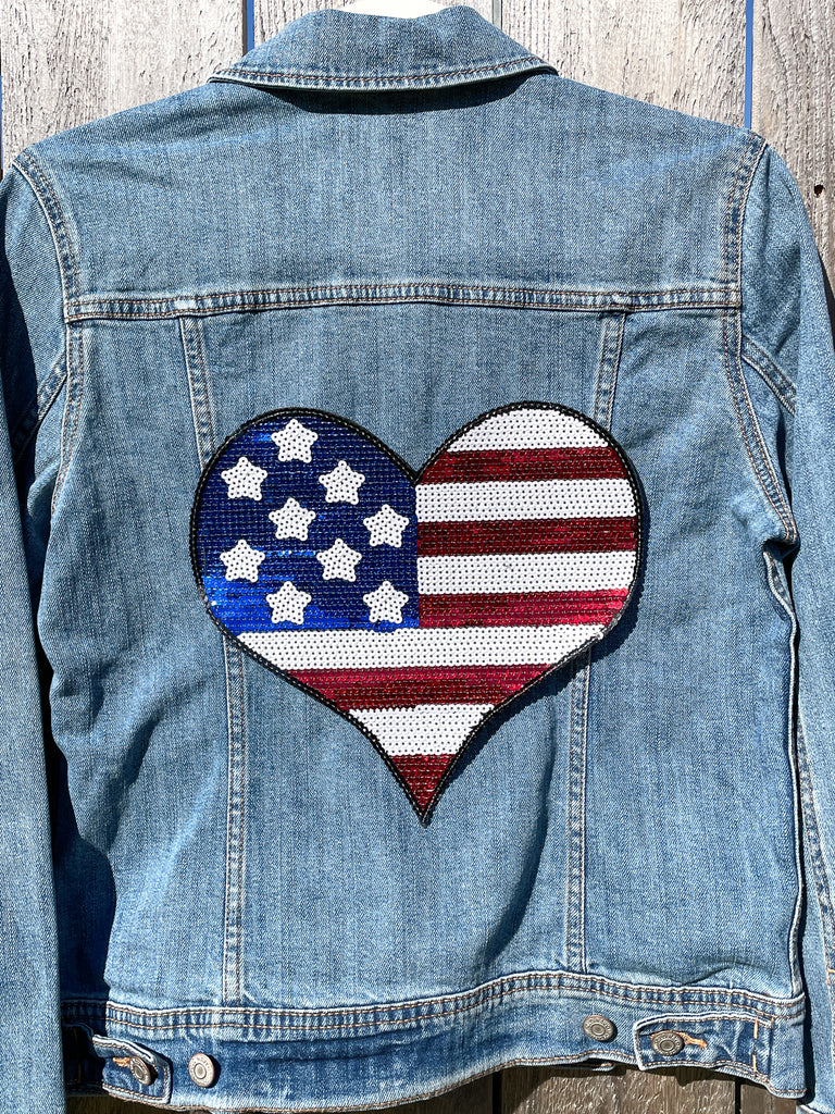 ✨🇺🇸 This is your perfect jacket! Unique and glamorous, make a statement with your sequin flag jean jacket and instantly add some flare to any outfit 🇺🇸✨